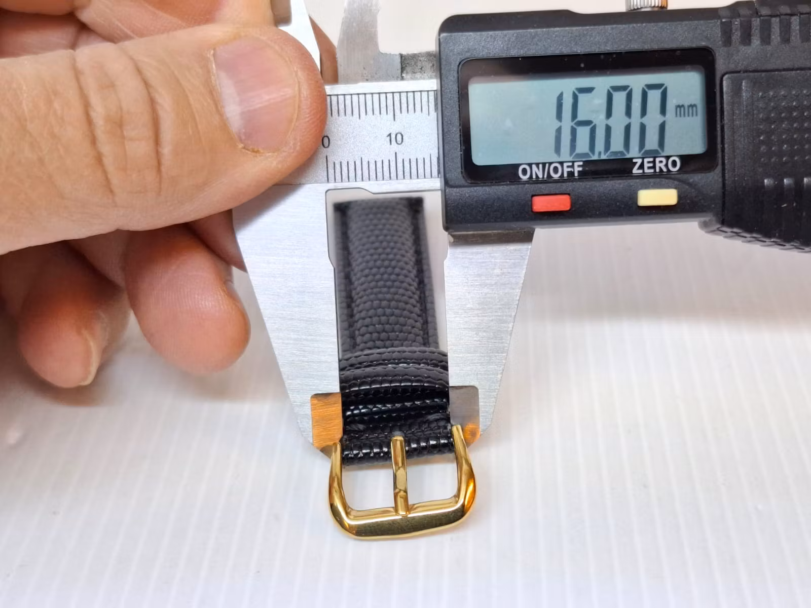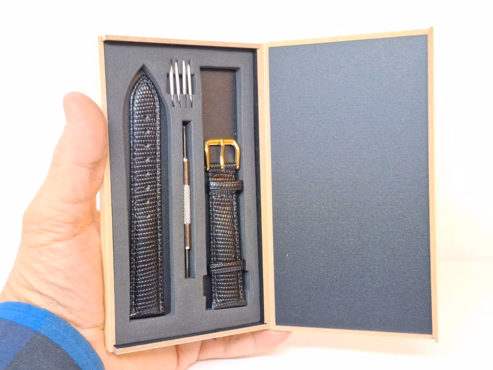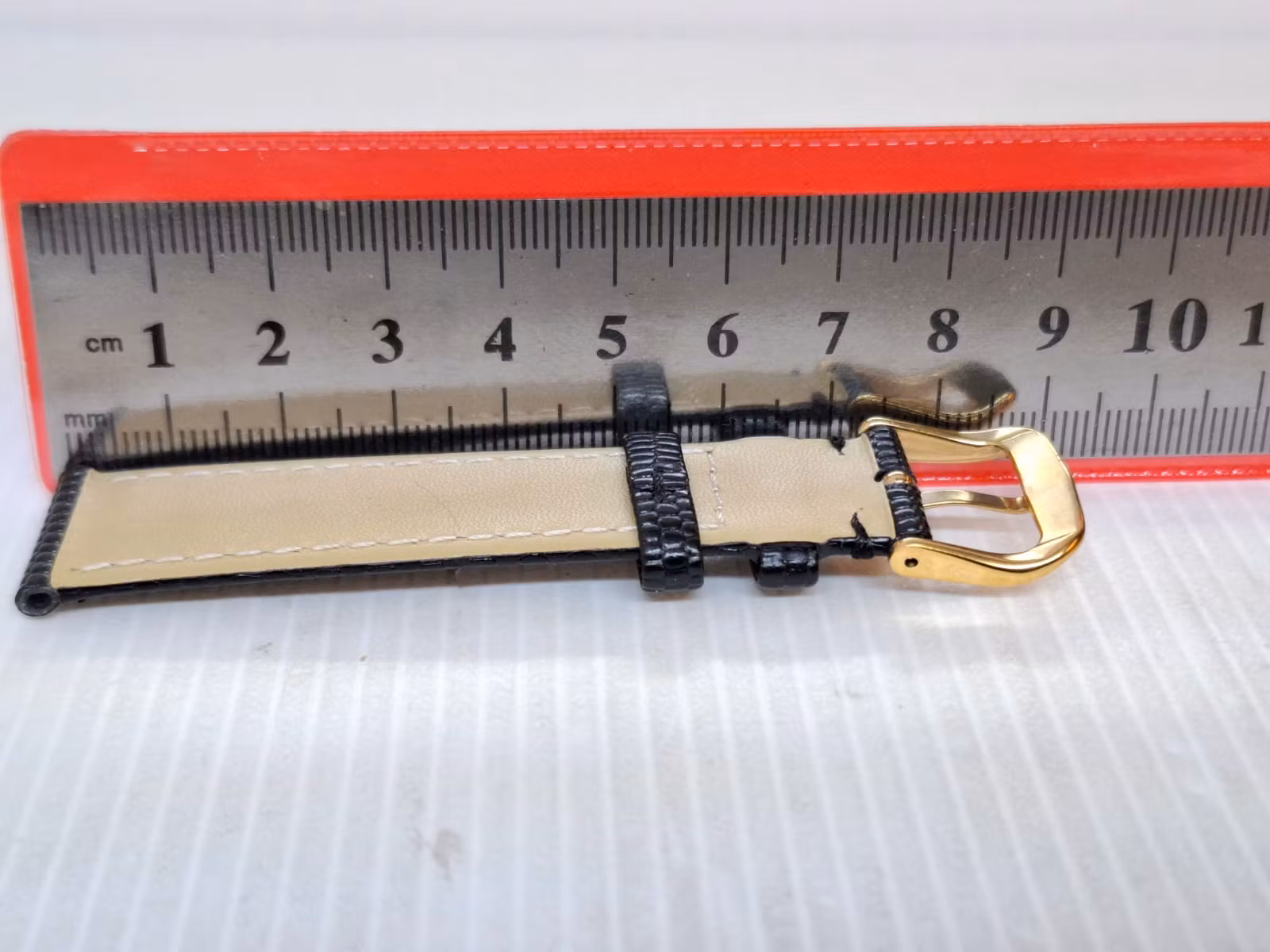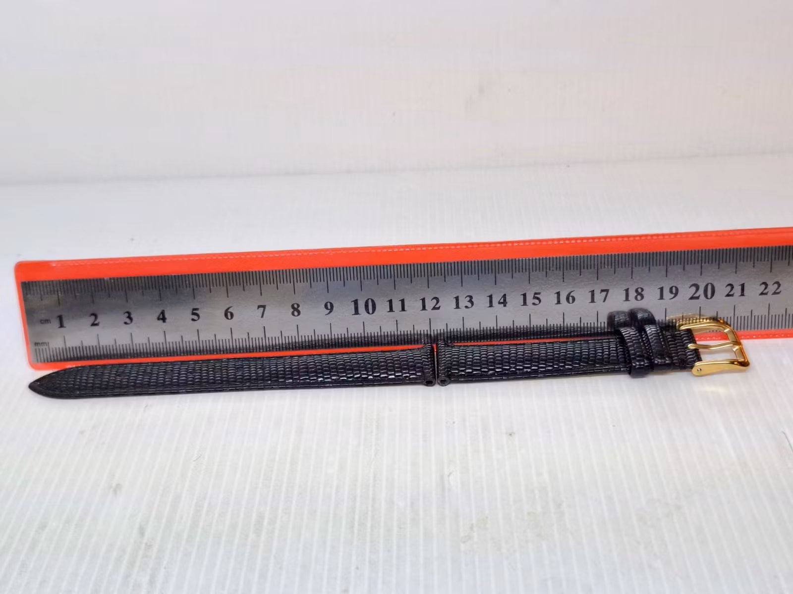 1) Ett armband i svart färg. Armbandet är tillverkad av äkta läder (kalvskinn) i hög kvalité från Hong Kong. Armbandet har ett mönster som påminner om mönster som ormar och ödlor har (se bilderna). Det svarta armbandet har ett spänne i guld färg. Armbandet passar till både dam- och herrklockor. Bredden på armbandet är 18 mm och bredd vid spännet är 16 mm. Längd på armbandet (den långa delen) är ca 12 cm. Längden på armbandet (den korta delen) är ca 9 cm (inklusive spänne, se bild).