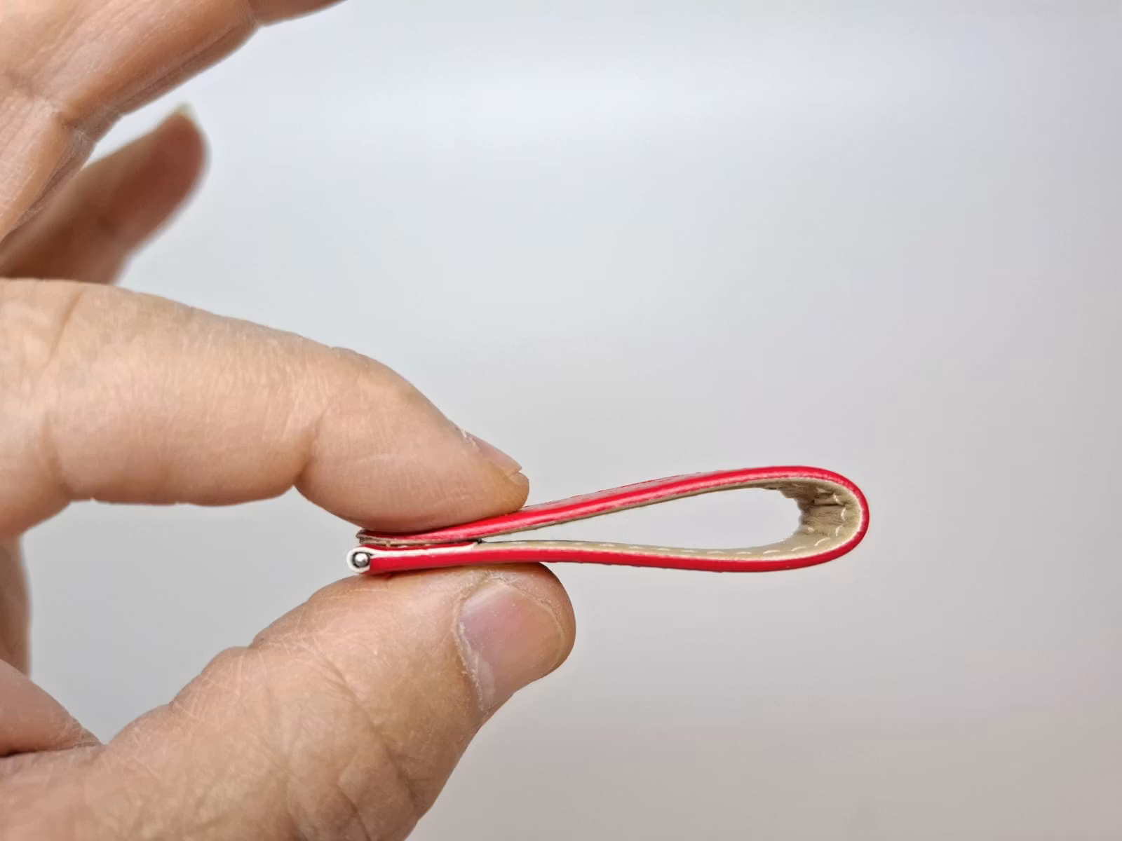 Du köper ett armband som kommer i röd färg. Armbandet är tillverkade i Hong Kong av läder. Spännet är i silver färg och har en liten puff i mitten (se bilder).