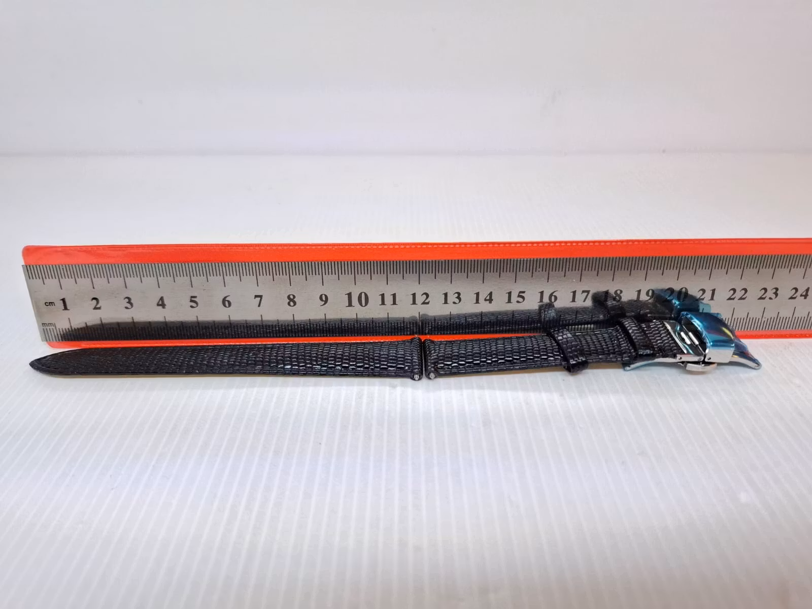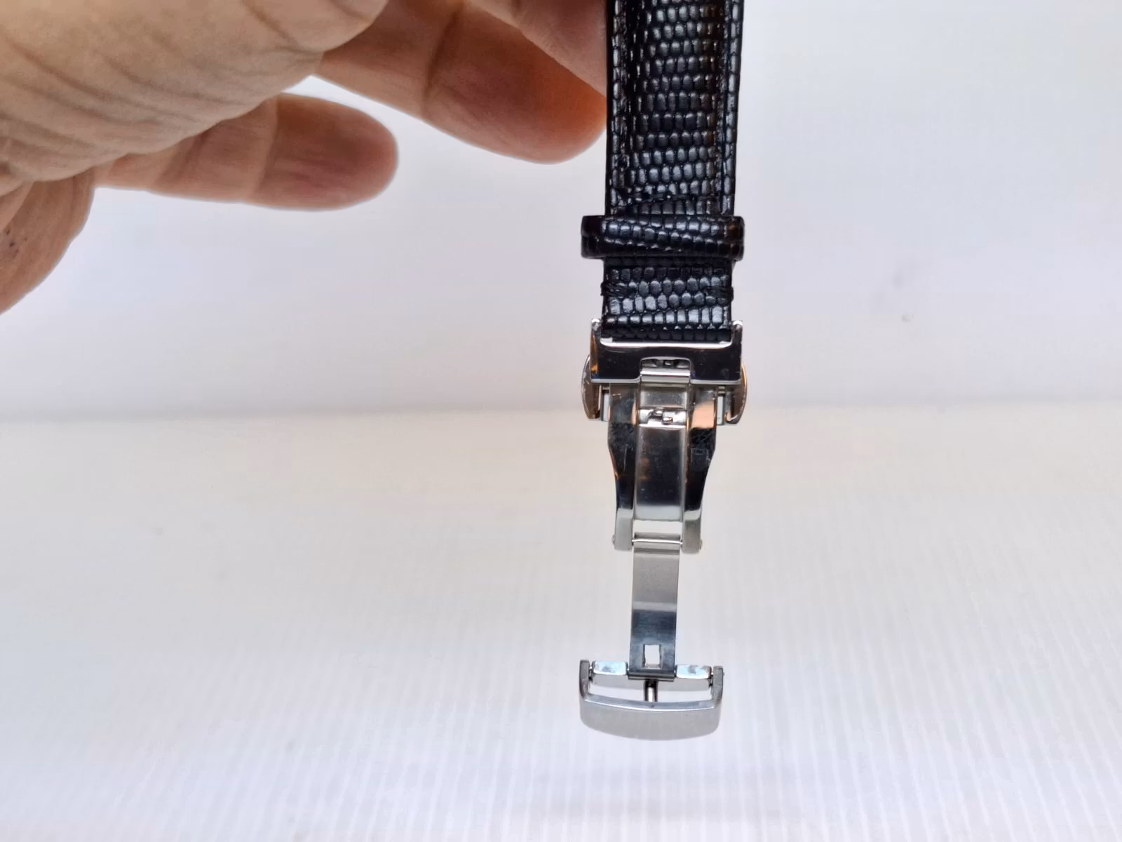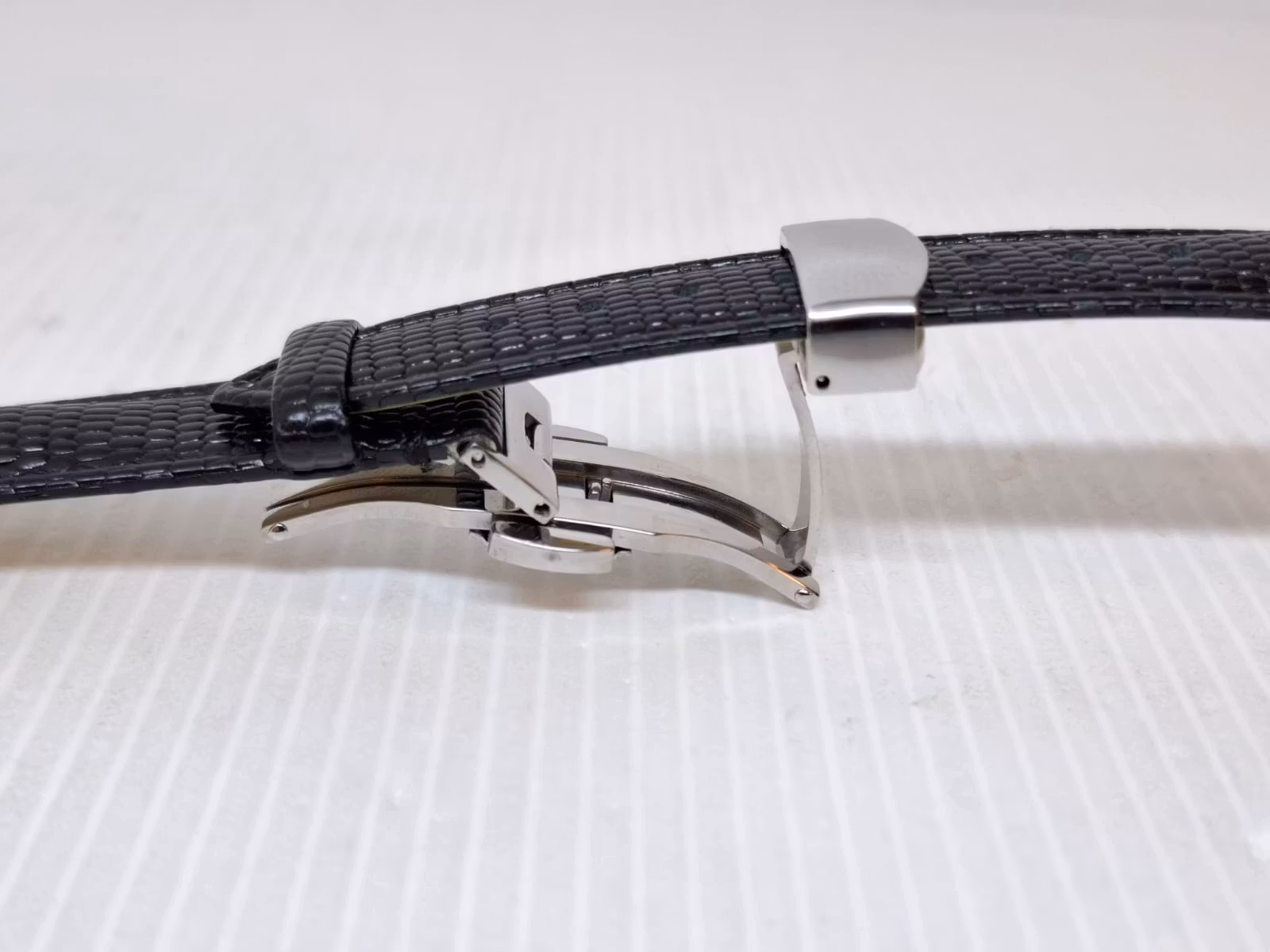 Du köper ett klockarmband som är gjord av äkta läder. Armbandet har ett mönster som påminner om mönster som ormar och ödlor har (se bilderna).Armbandet har ett annorlunda och unikt spänne; ett ihopfällbart spänne som öppnas genom att trycka på knappen. Armbandet kommer i svart färg och passar både dam och herr. Spännet är silverfärgat och det medföljer 2 stycken bandstift.