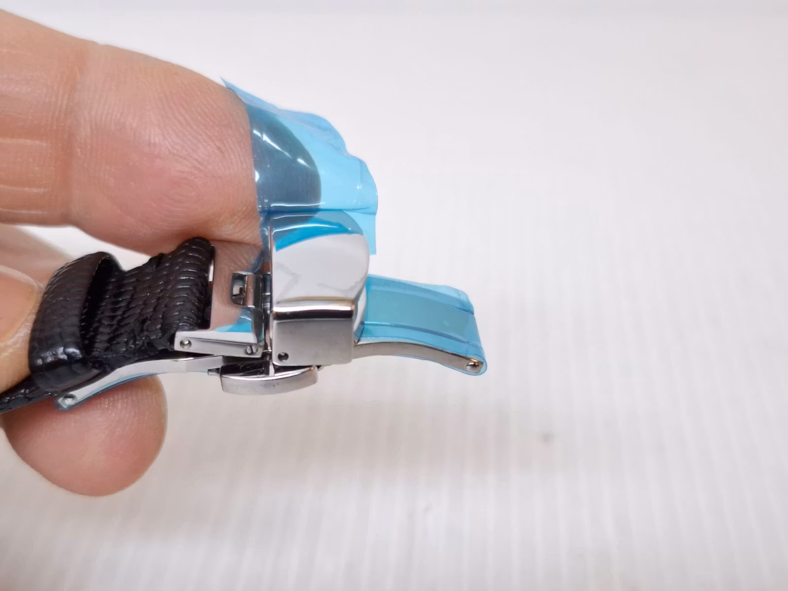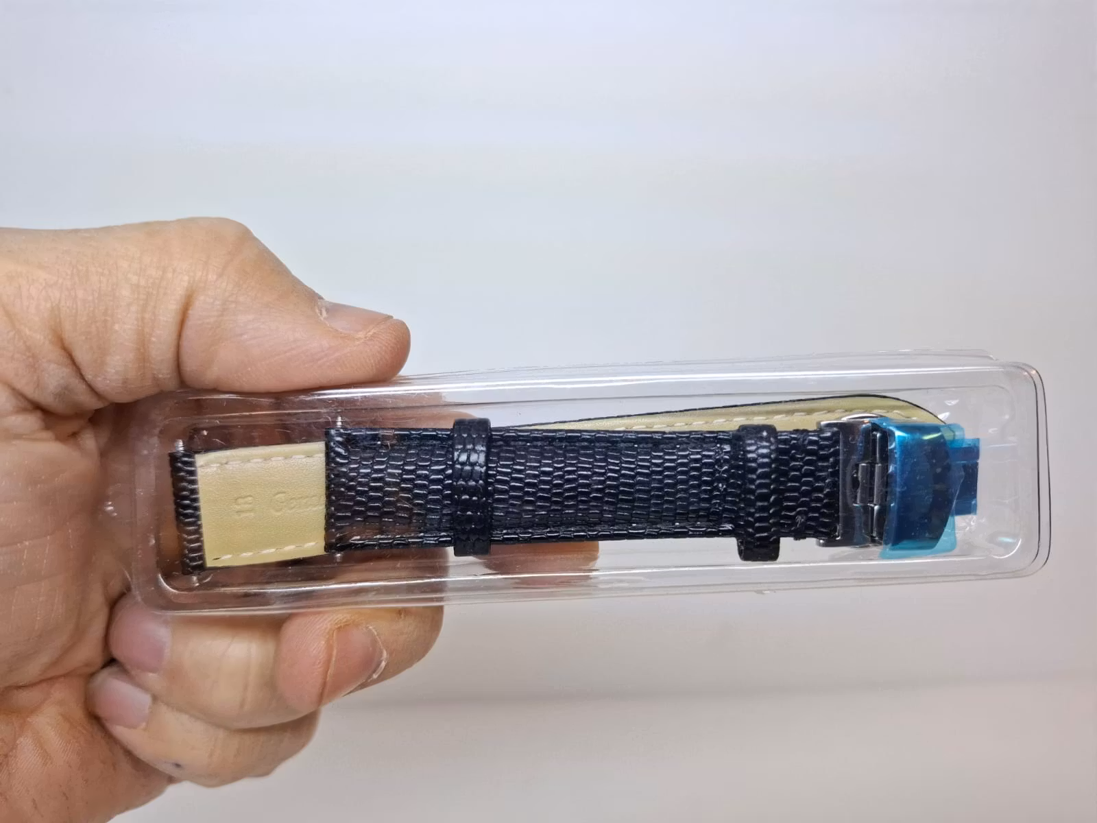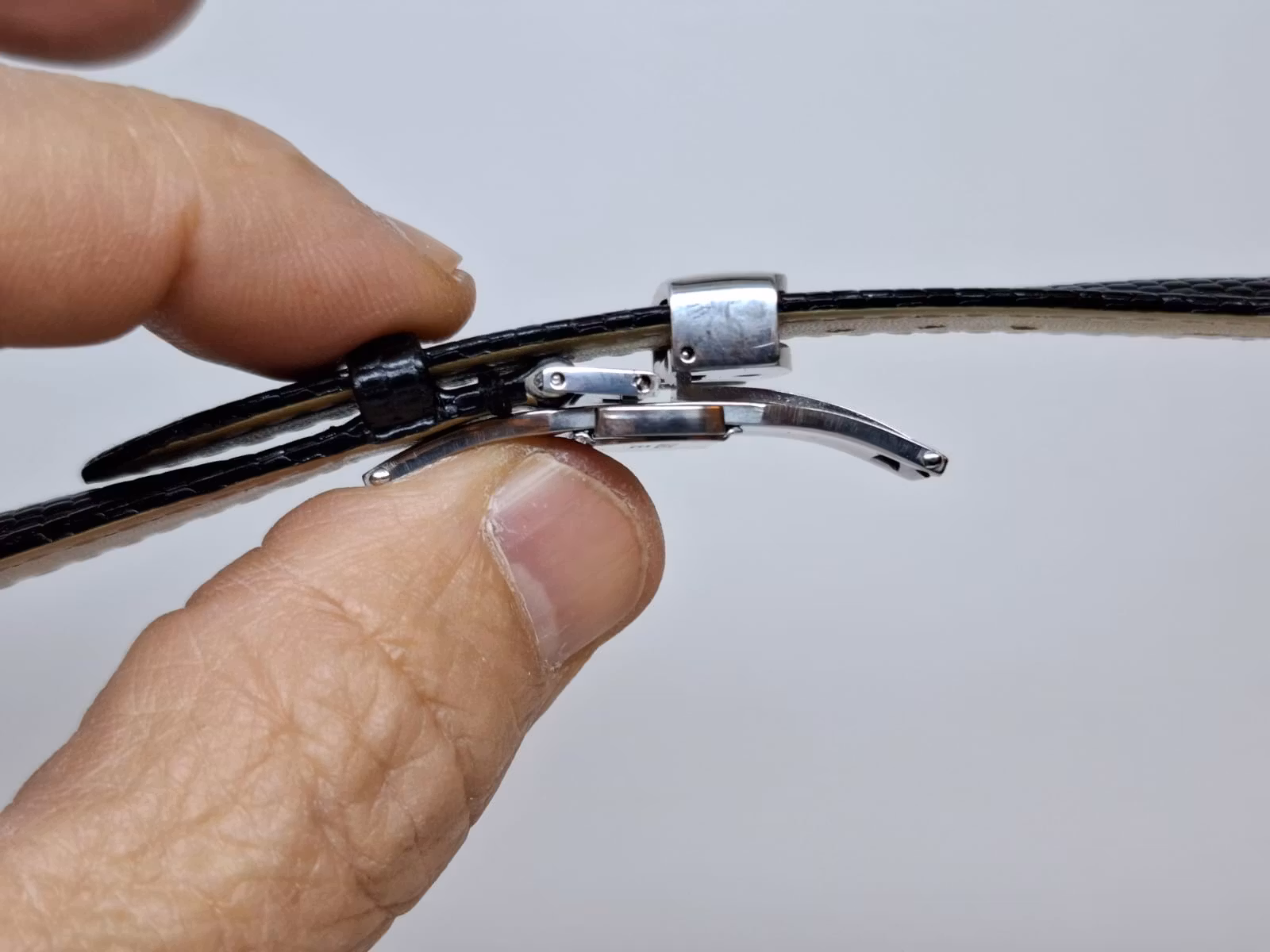 Du köper ett klockarmband som är gjord av äkta läder. Armbandet har ett mönster som påminner om mönster som ormar och ödlor har (se bilderna).Armbandet har ett annorlunda och unikt spänne; ett ihopfällbart spänne som öppnas genom att trycka på knappen. Armbandet kommer i svart färg och passar både dam och herr. Spännet är silverfärgat och det medföljer 2 stycken bandstift.