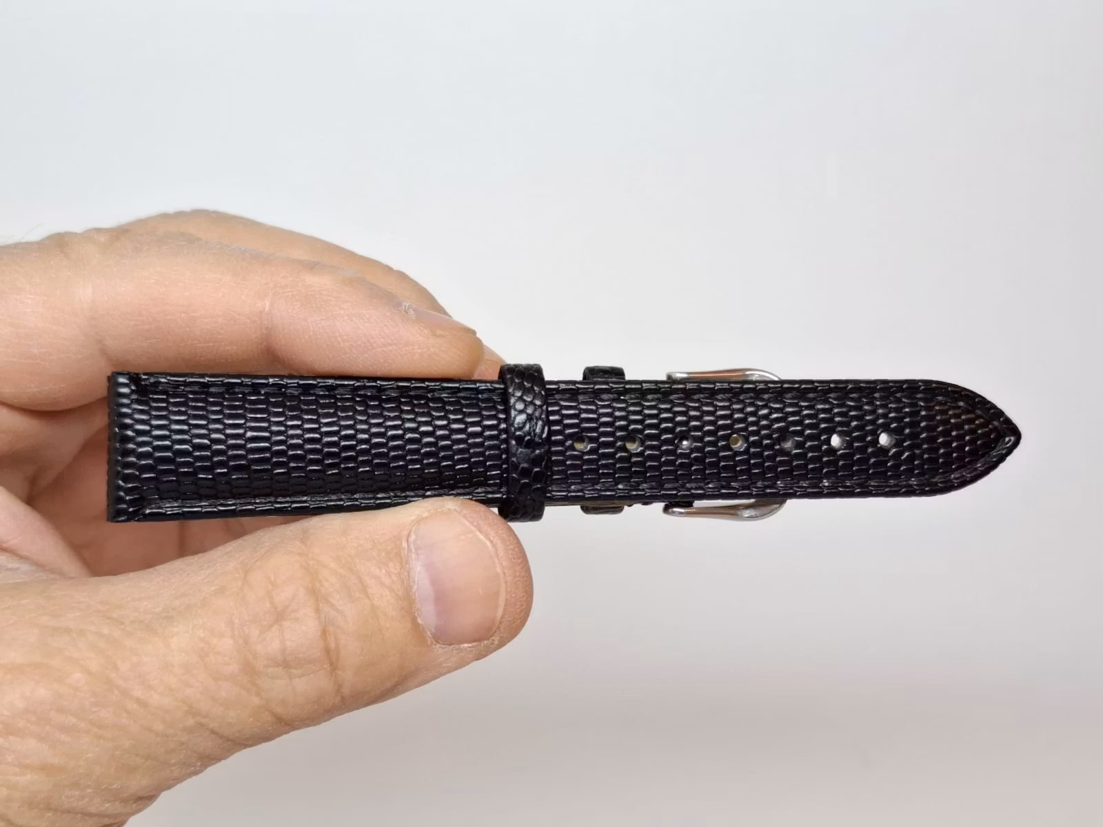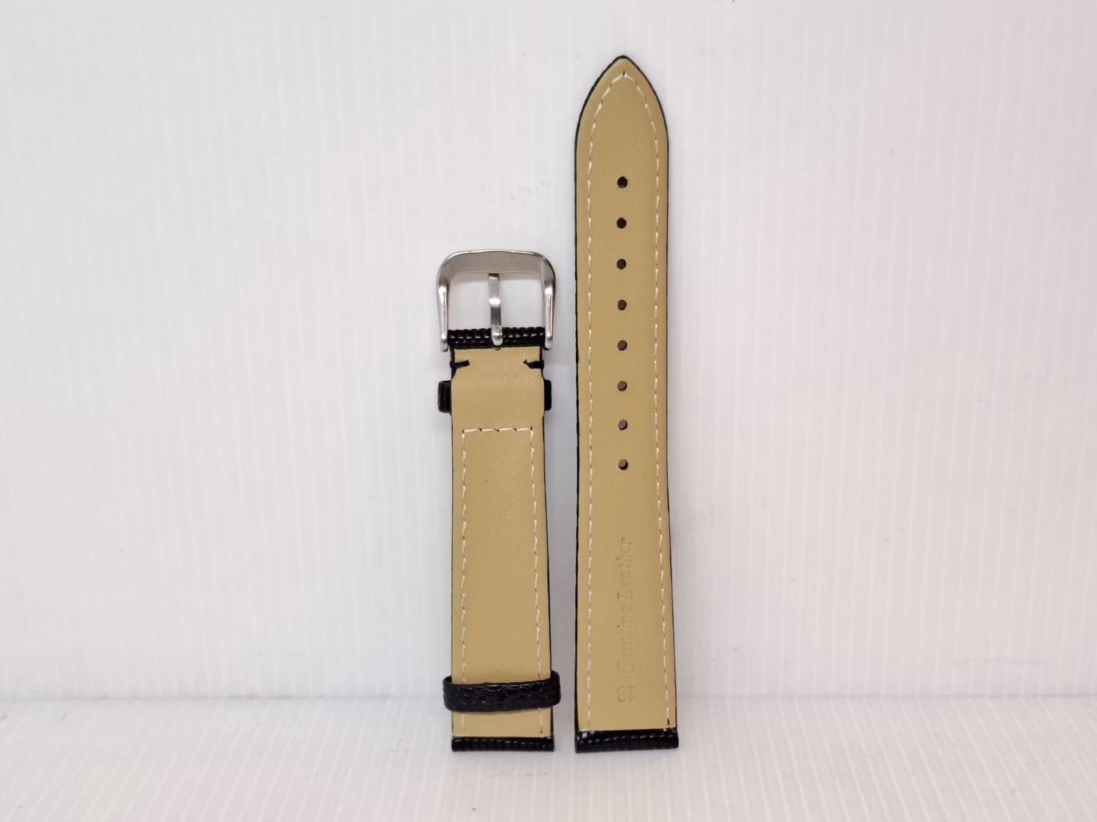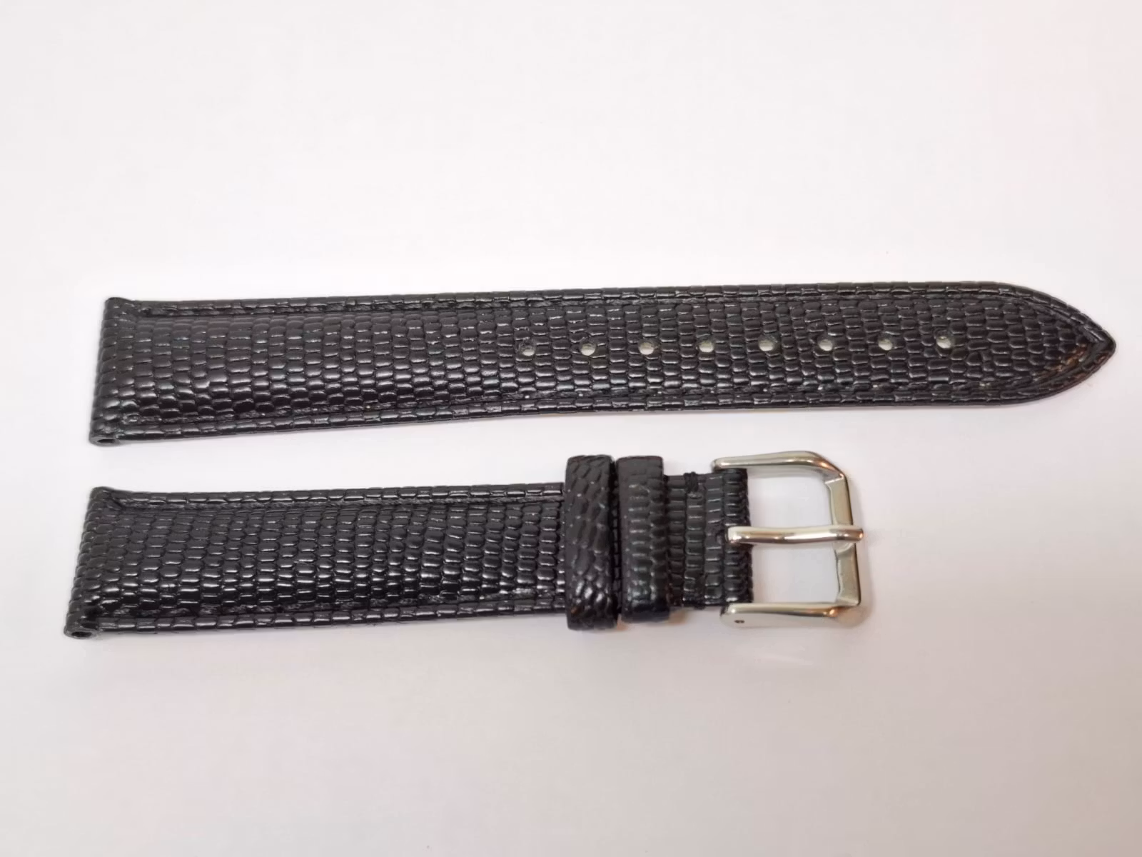 1) Ett armband i svart färg. Armbandet är tillverkad av äkta läder (kalvskinn) i hög kvalité från Hong Kong. Armbandet har ett mönster som påminner om mönster som ormar och ödlor har (se bilderna). Det svarta armbandet har ett spänne i silver färg. Armbandet passar till både dam- och herrklockor. Bredden på armbandet är 18 mm och bredd vid spännet är 16 mm. Längd på armbandet (den långa delen) är ca 12 cm. Längden på armbandet (den korta delen) är ca 9 cm (inklusive spänne, se bild).