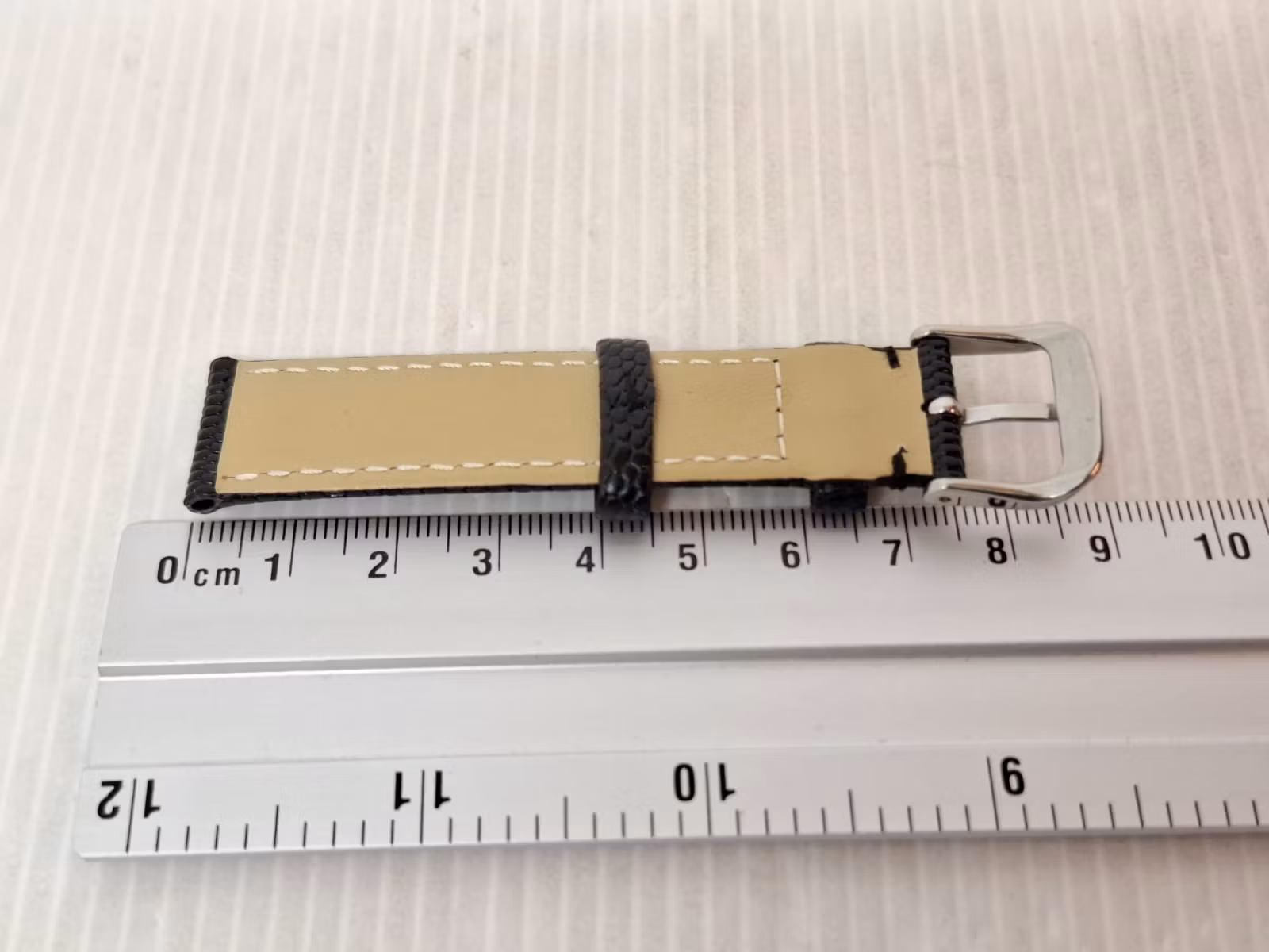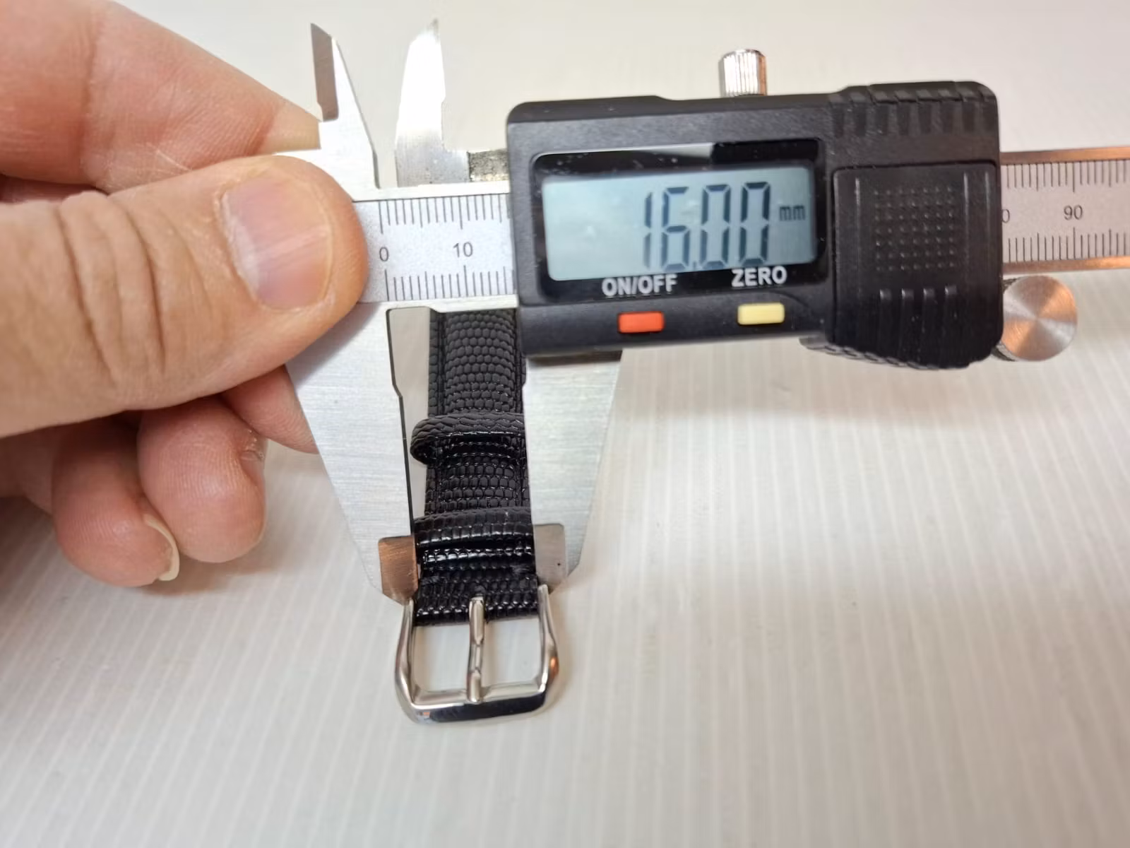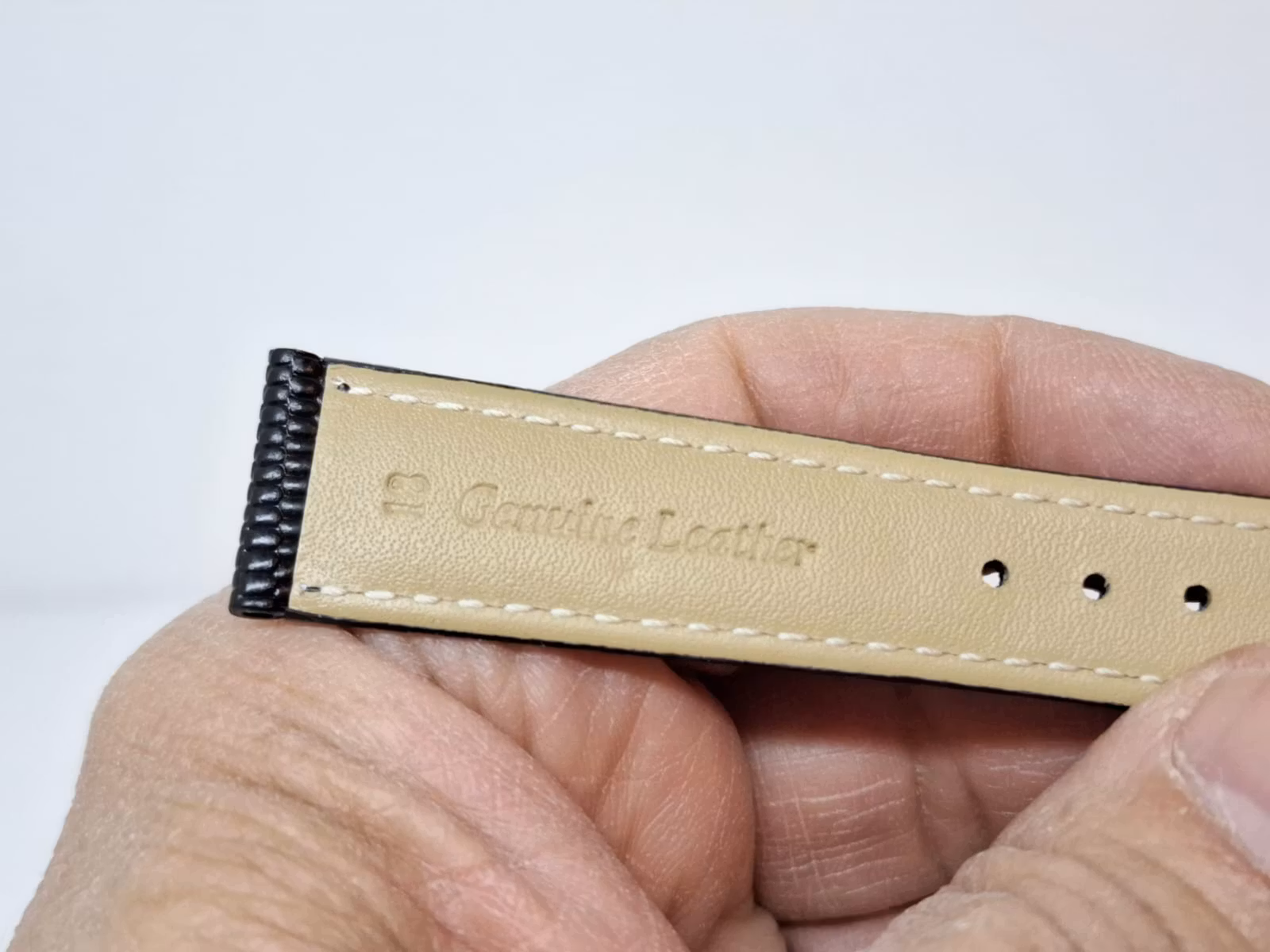 1) Ett armband i svart färg. Armbandet är tillverkad av äkta läder (kalvskinn) i hög kvalité från Hong Kong. Armbandet har ett mönster som påminner om mönster som ormar och ödlor har (se bilderna). Det svarta armbandet har ett spänne i silver färg. Armbandet passar till både dam- och herrklockor. Bredden på armbandet är 18 mm och bredd vid spännet är 16 mm. Längd på armbandet (den långa delen) är ca 12 cm. Längden på armbandet (den korta delen) är ca 9 cm (inklusive spänne, se bild).