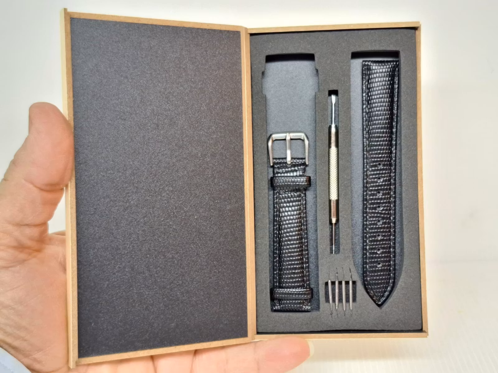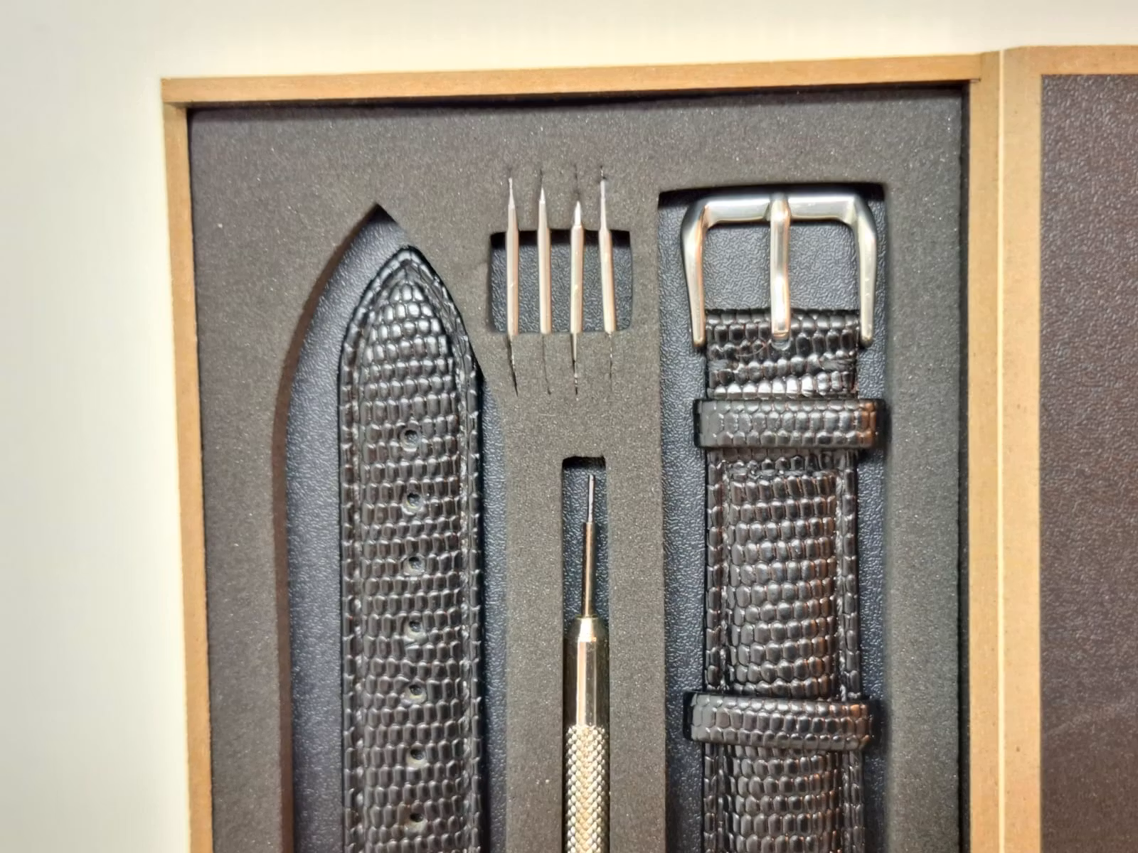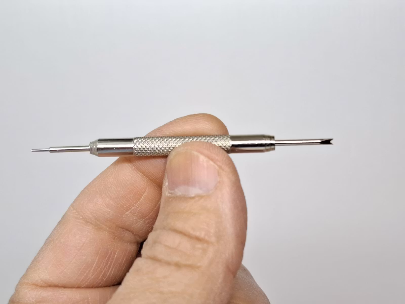 2) Ett bandstiftsverktyg. Detta verktyg är praktisk att använda vid byte av klockarmband på klockor. Verktyget har en så kallad svanhals och som används för att enkelt komma åt stift utan att skada bandet eller klockan. Verktyget är tillverkad i metall.