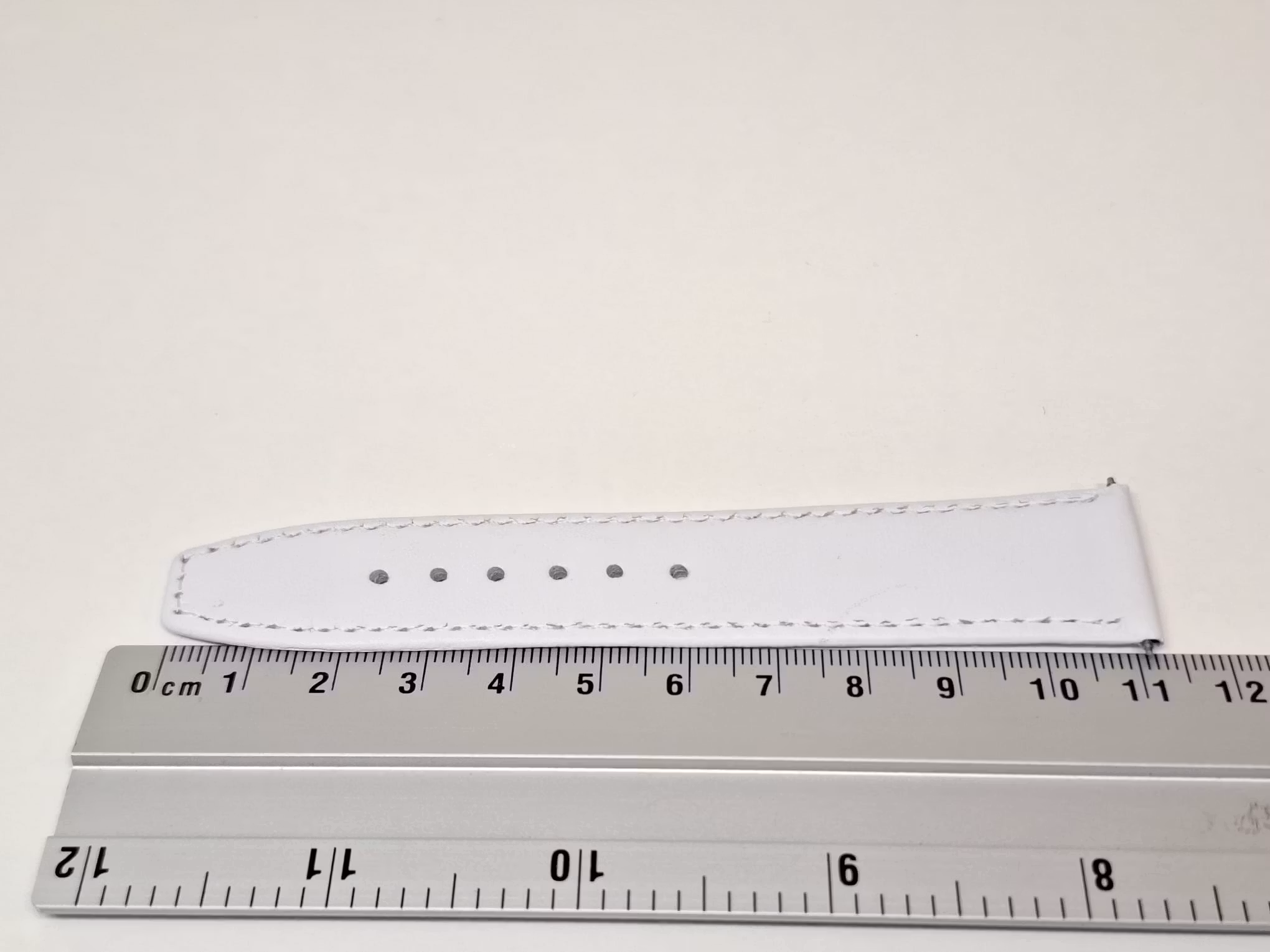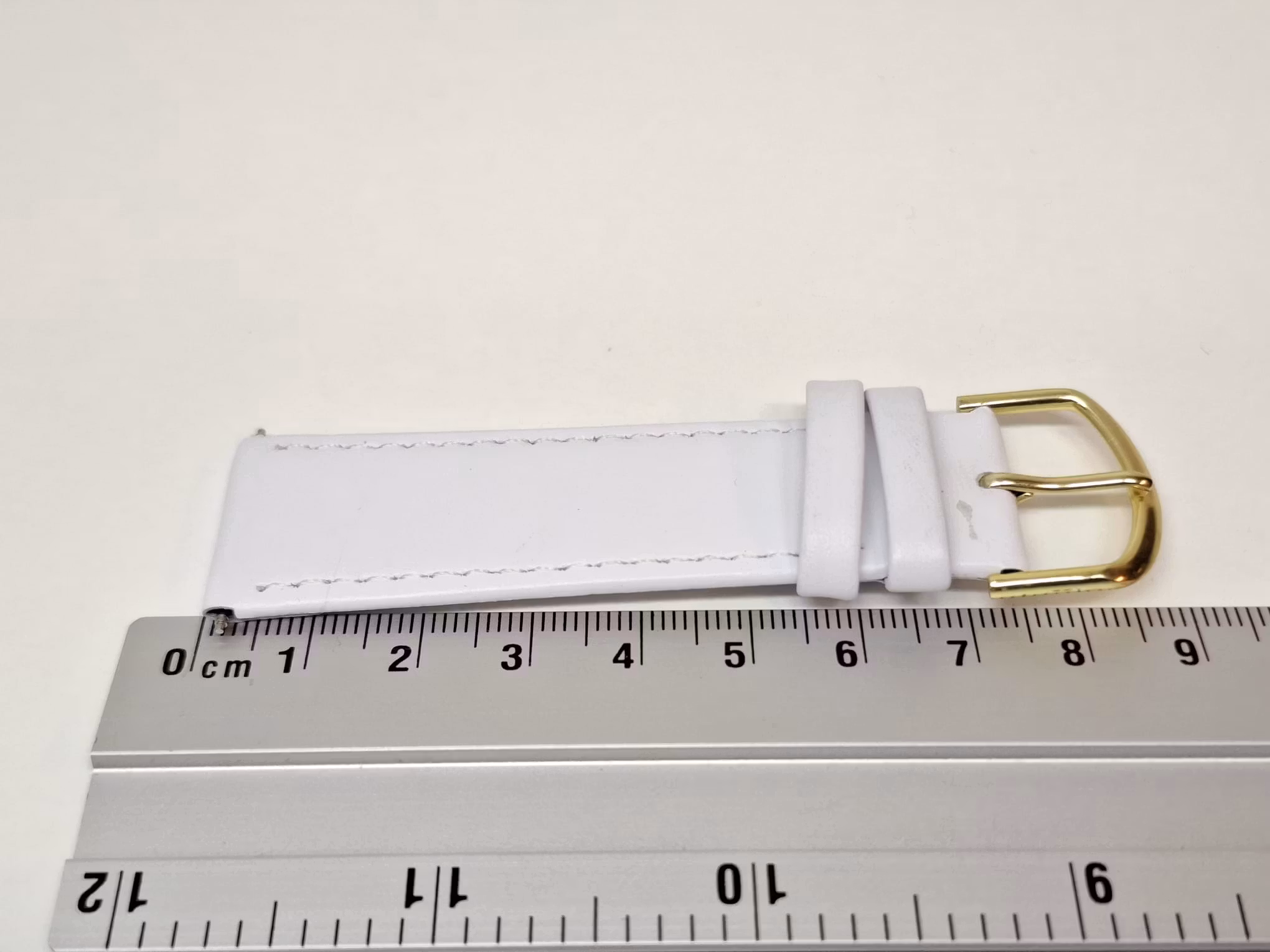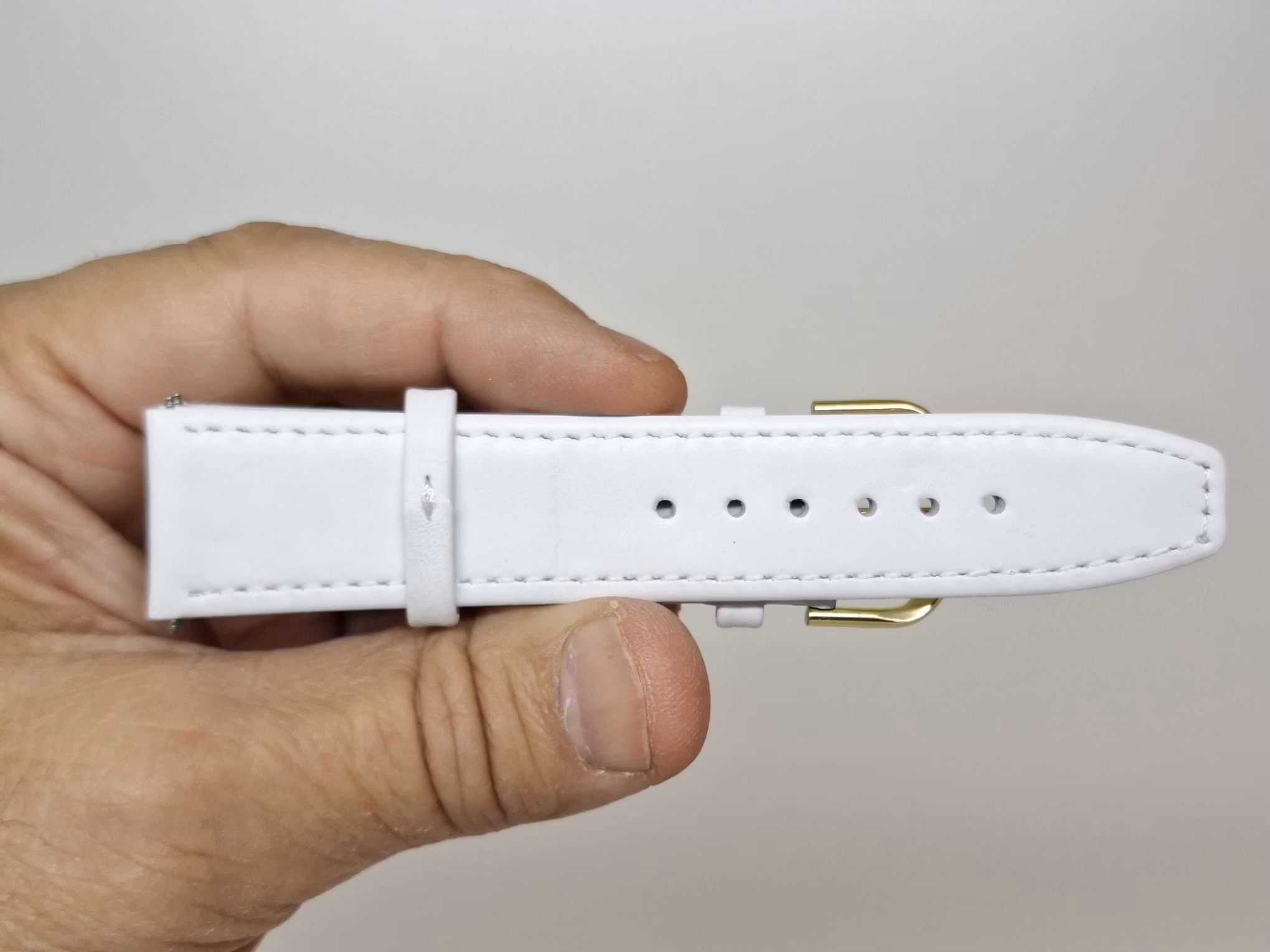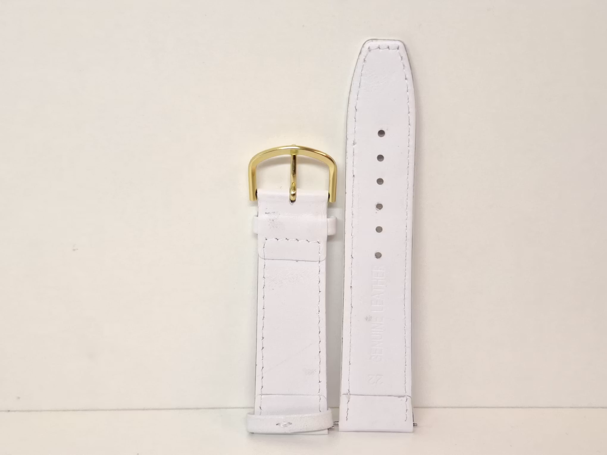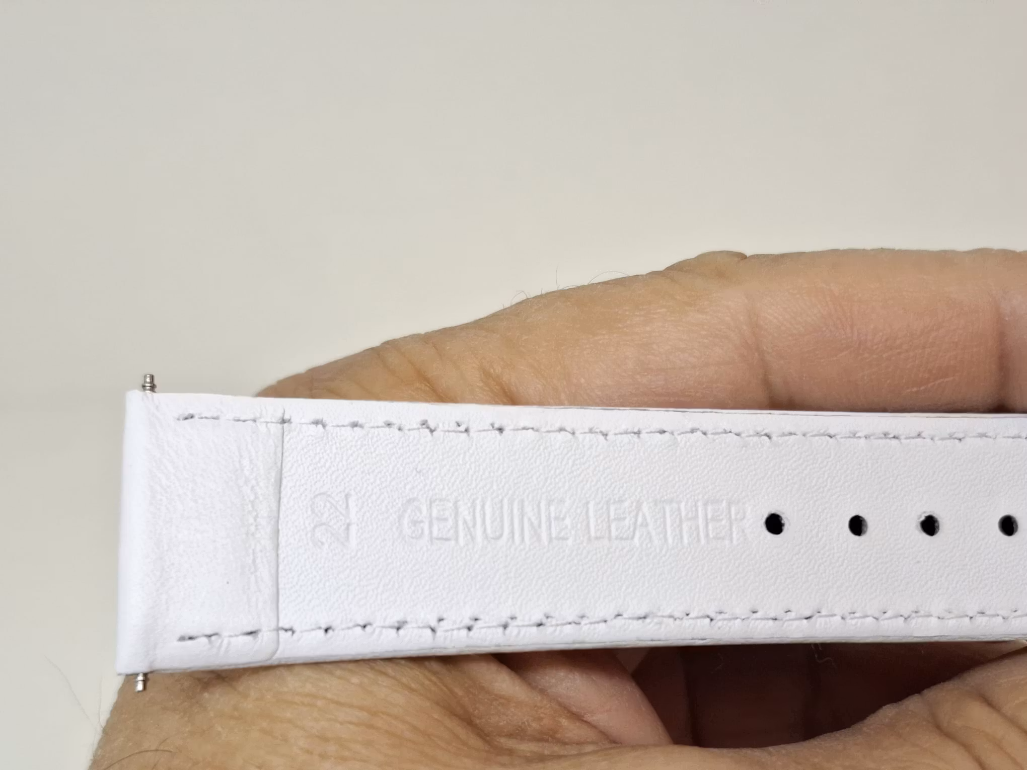 Du köper ett armband som kommer i vit färg. Armbandet är tillverkade i Hong Kong av äkta läder (kalvskinn). Spännet kommer i guld färg. Det medföljer två stycken bandstift. Se bilder.