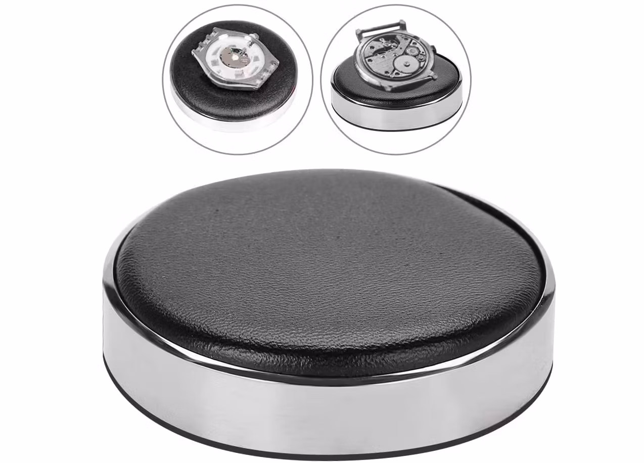 Du köper en skyddsdyna / kudde som är ett praktiskt verktyg som du kan placera din klocka på. Läderkudden är mjuk och är ämnad för att skydda glaset mot slitage på din klocka medans du reparerar den. Undersidan är av hård anti-glid plast vilket håller verktyget stadigt. Det går även att använda kudden till andra ändamål, som exempelvis hantering av smycken, juveler, skruvar, med mera. Produkten kommer i sin förpackning.
