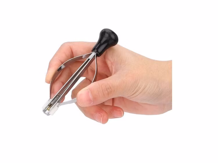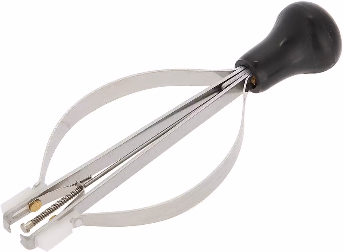 1) En borttagningsklämma som fungerar som ett verktyg för att få bort visarna från klockan. Den är tillverkad av metall.