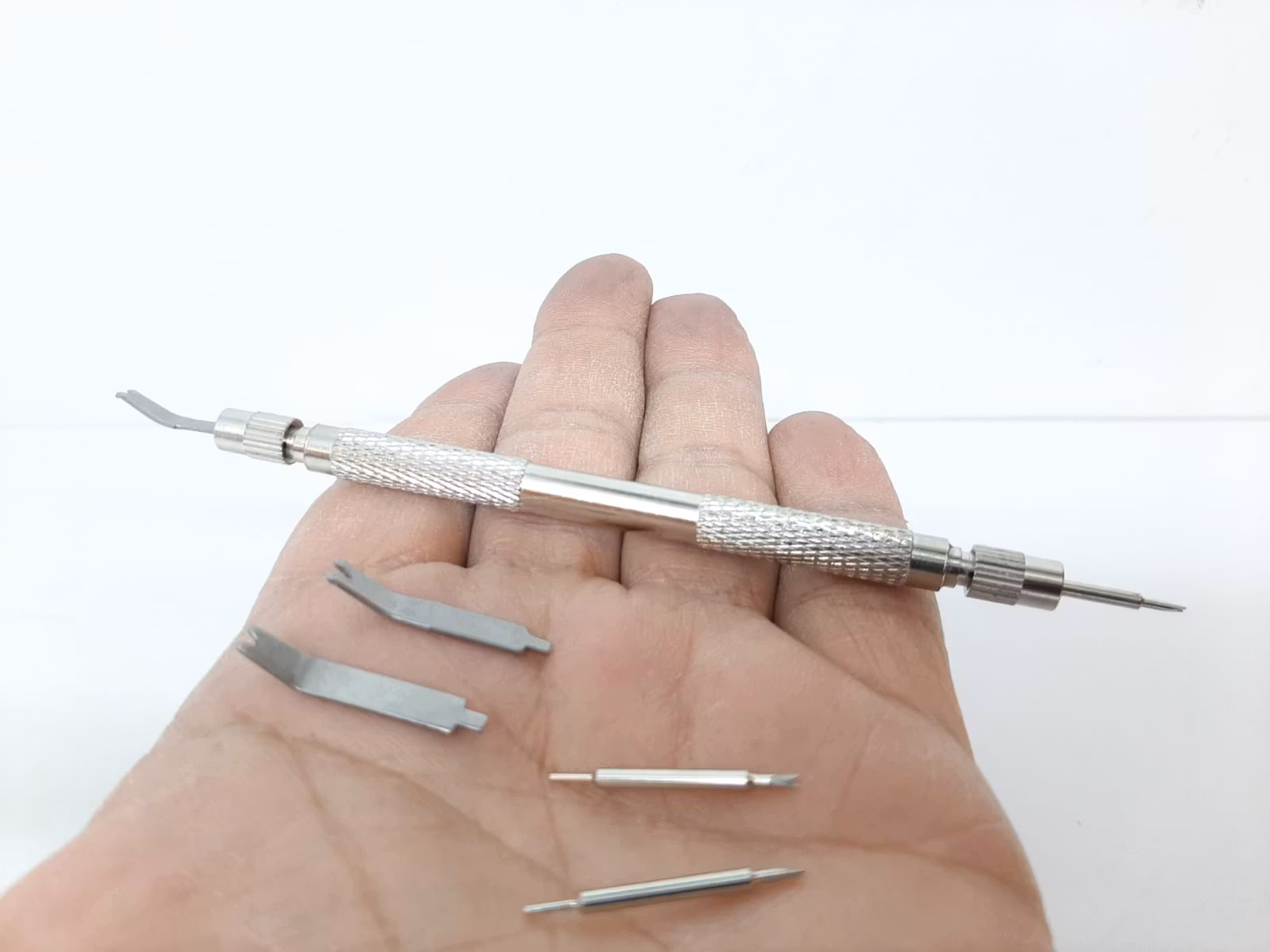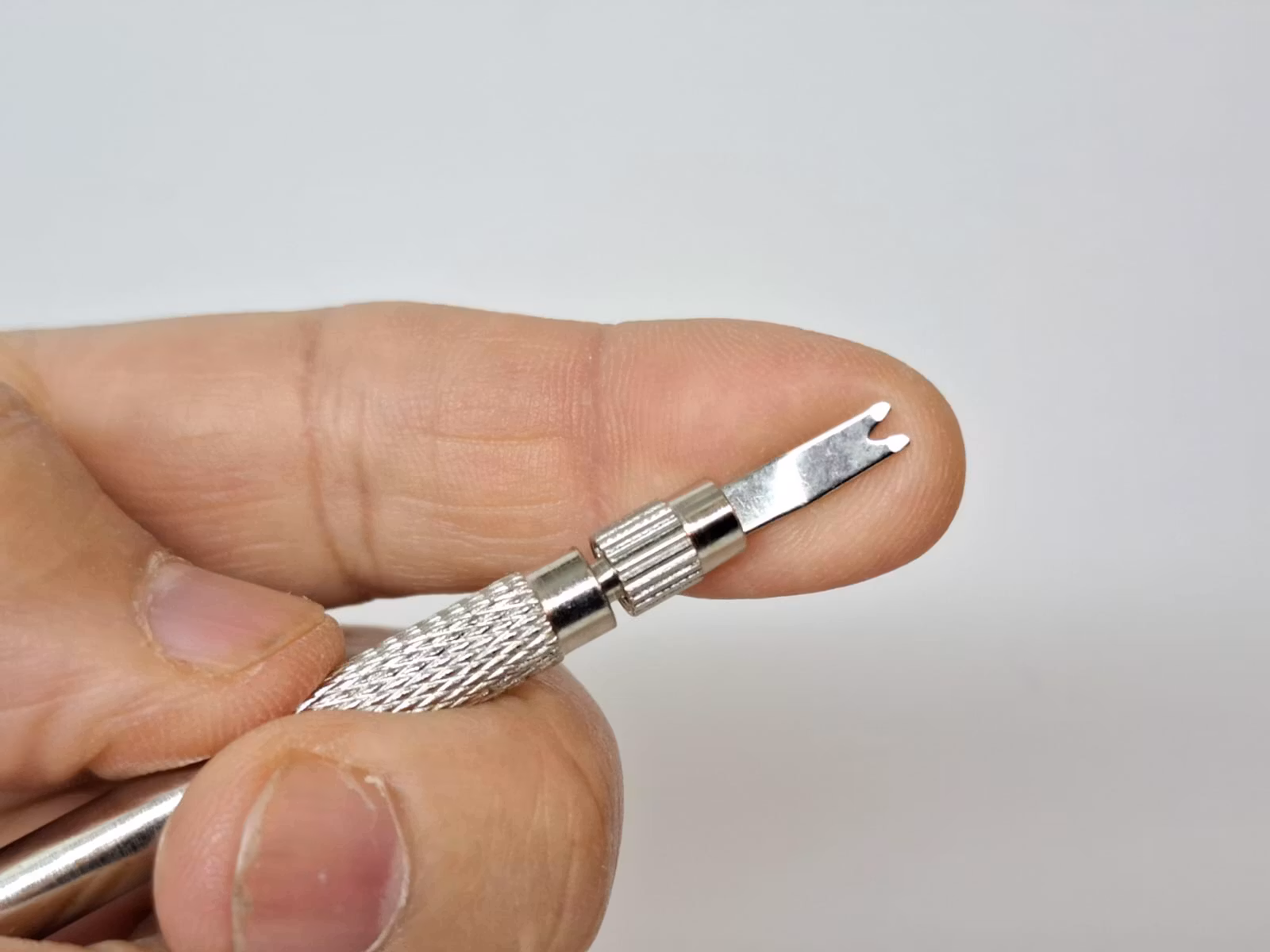 Verktyget har en så kallad svanhals och som används för att enkelt komma åt stiften i klockarmbandet, utan att skada bandet eller klockan.