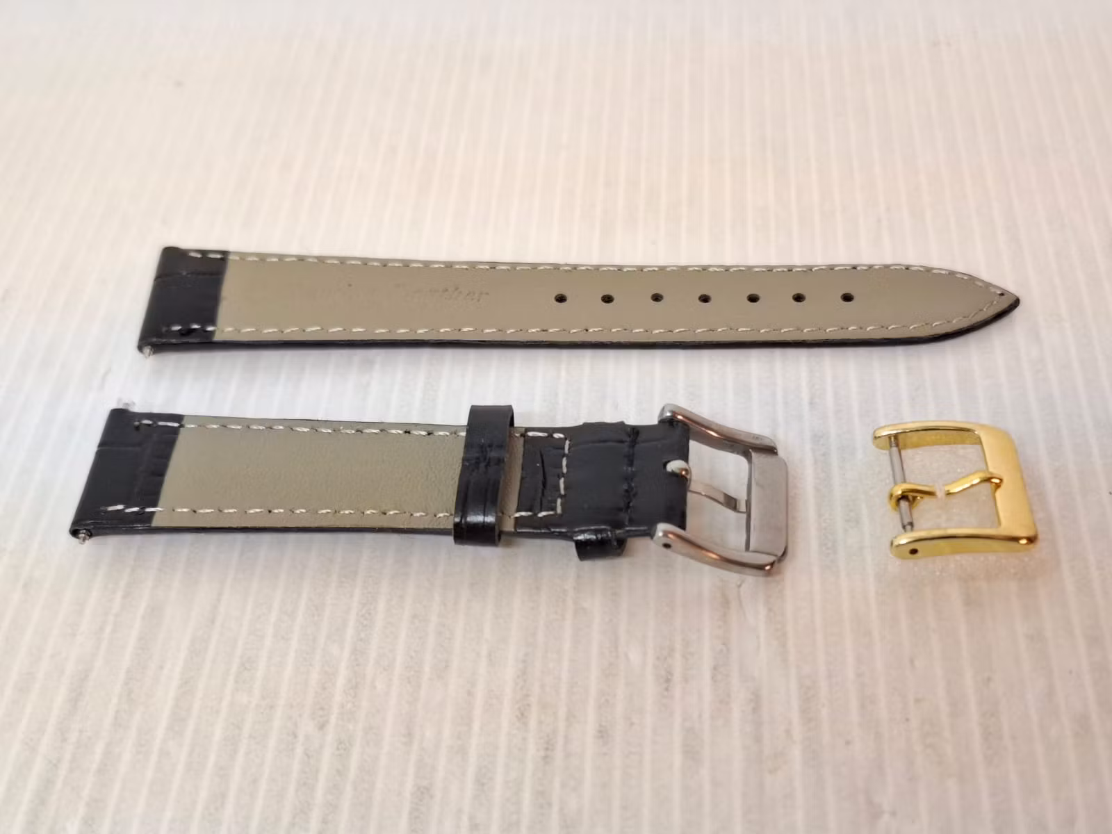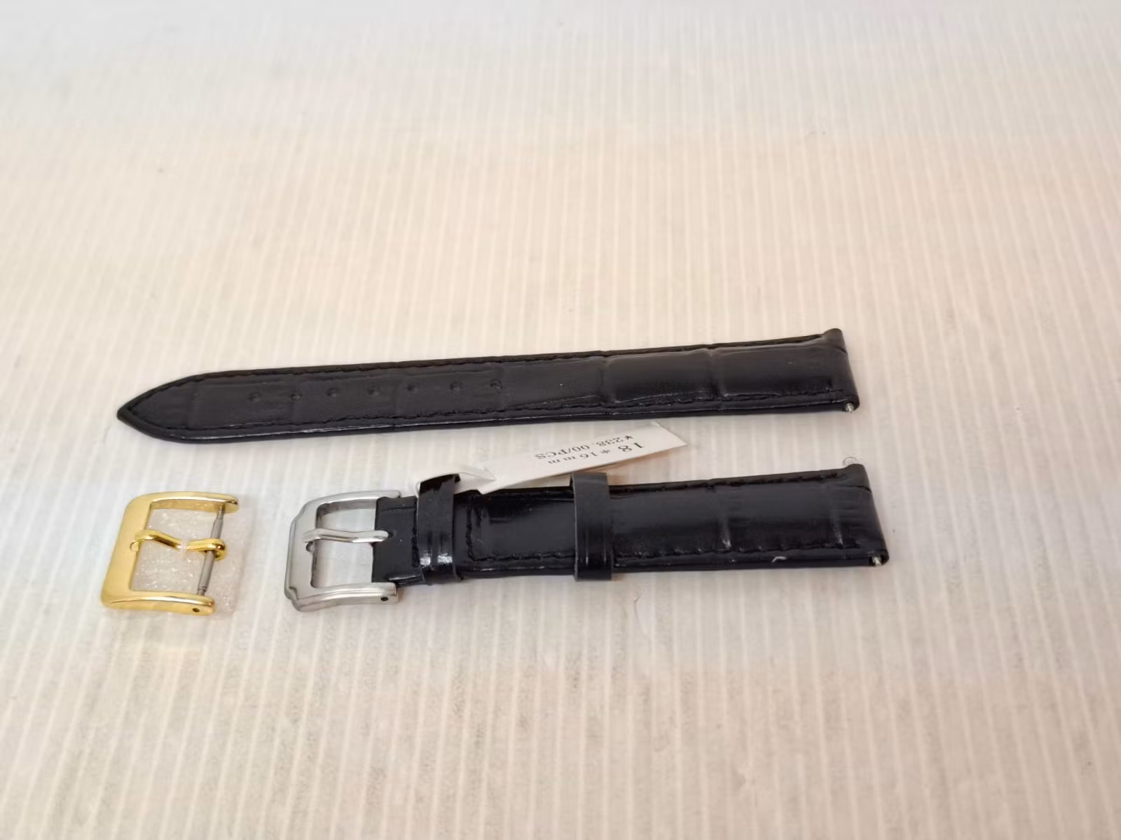 Du köper en presentförpackning som innehåller ett armband i svart färg. Armbandet är tillverkad av äkta läder i hög kvalité. Du har möjlighet att välja mellan både silverfärgat och guldfärgat spänne (se bilderna). Armbandet passar till både dam- och herrklockor. Bredden på armbandet är 18 mm och bredd vid spännet är 16 mm. Längd på armbandet (den långa delen) är ca 12 cm. Längden på armbandet (den korta delen) är ca 8.7 cm (inklusive spänne, se bild). Bandstift medföljer.