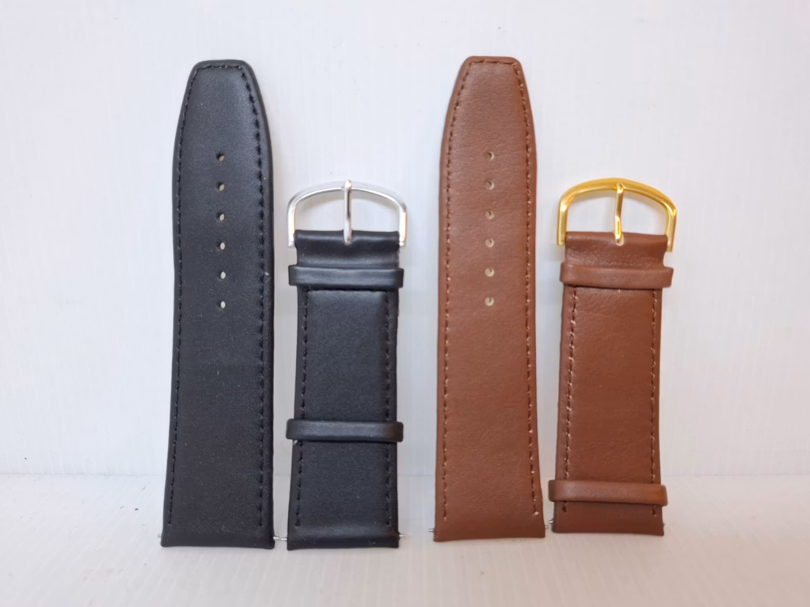 Du köper två armband (en i svart färg och en i brun färg). Armbanden är tillverkade i Hong Kong av äkta kalvskinn (läder). Det svarta armbandet har ett spänne i silver färg, medan det bruna armbandet har ett spänne i guld färg. Det medföljer två bandstift till varje armband. Passar både dam och herr.
