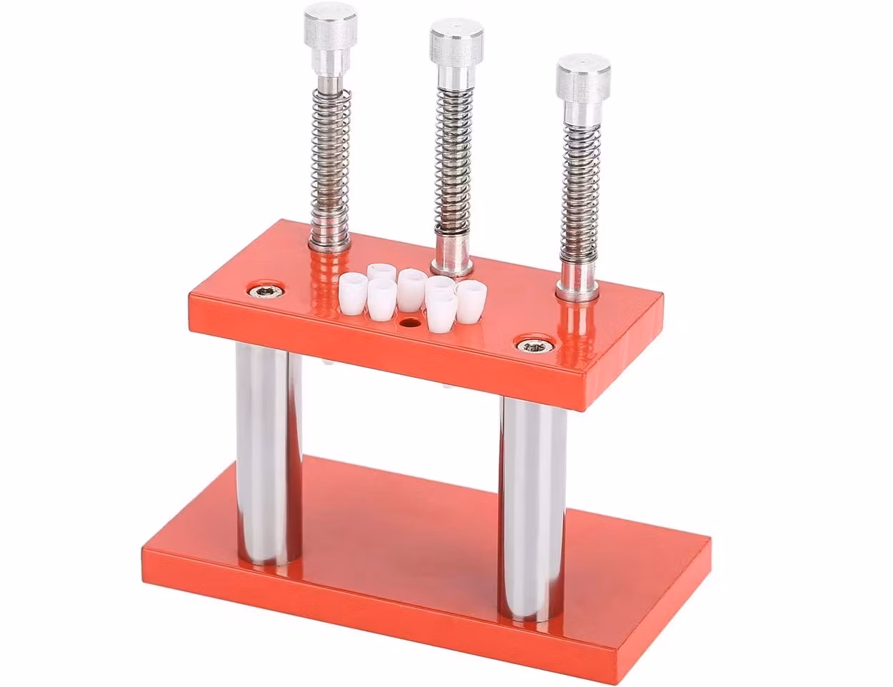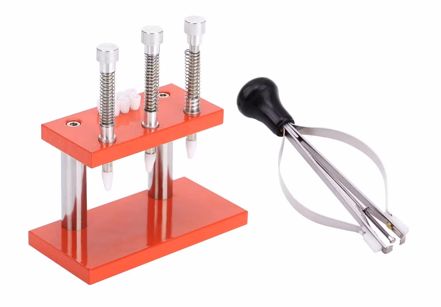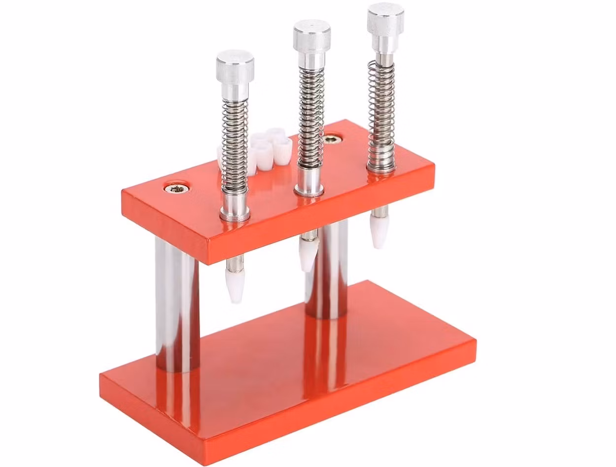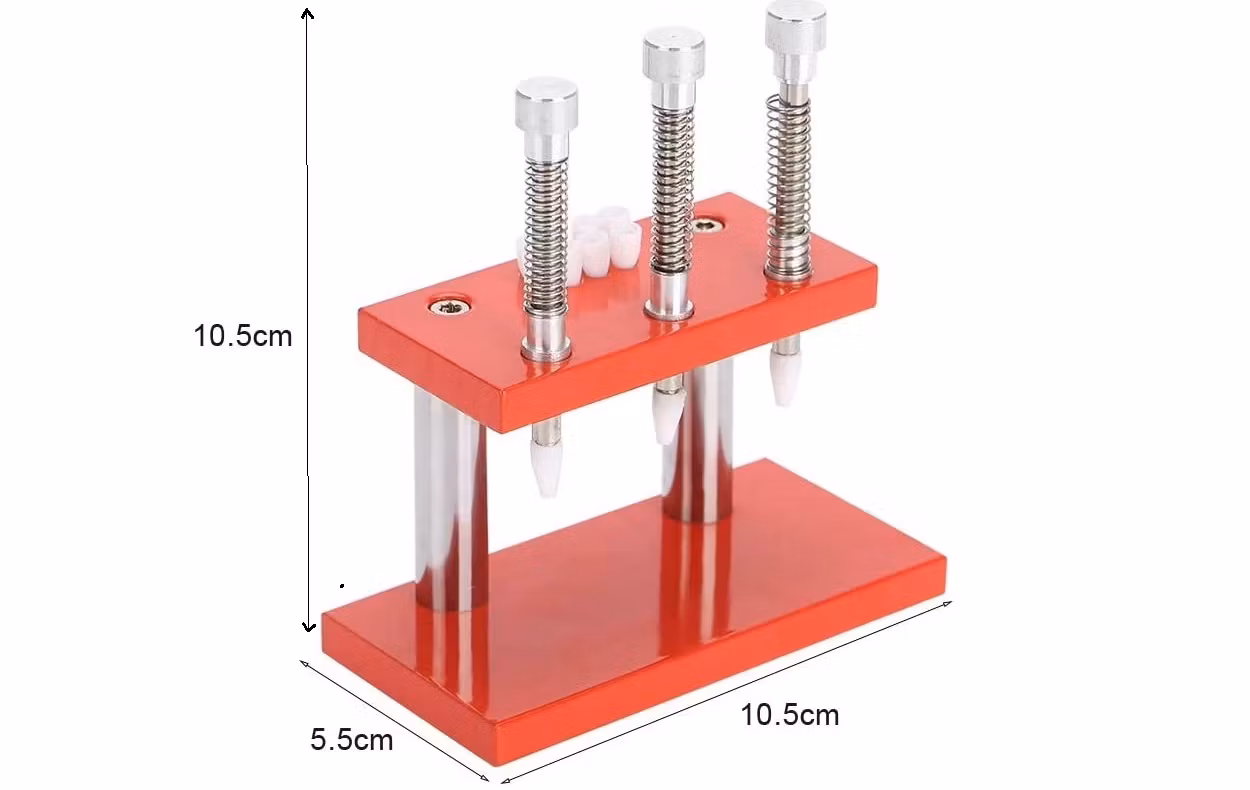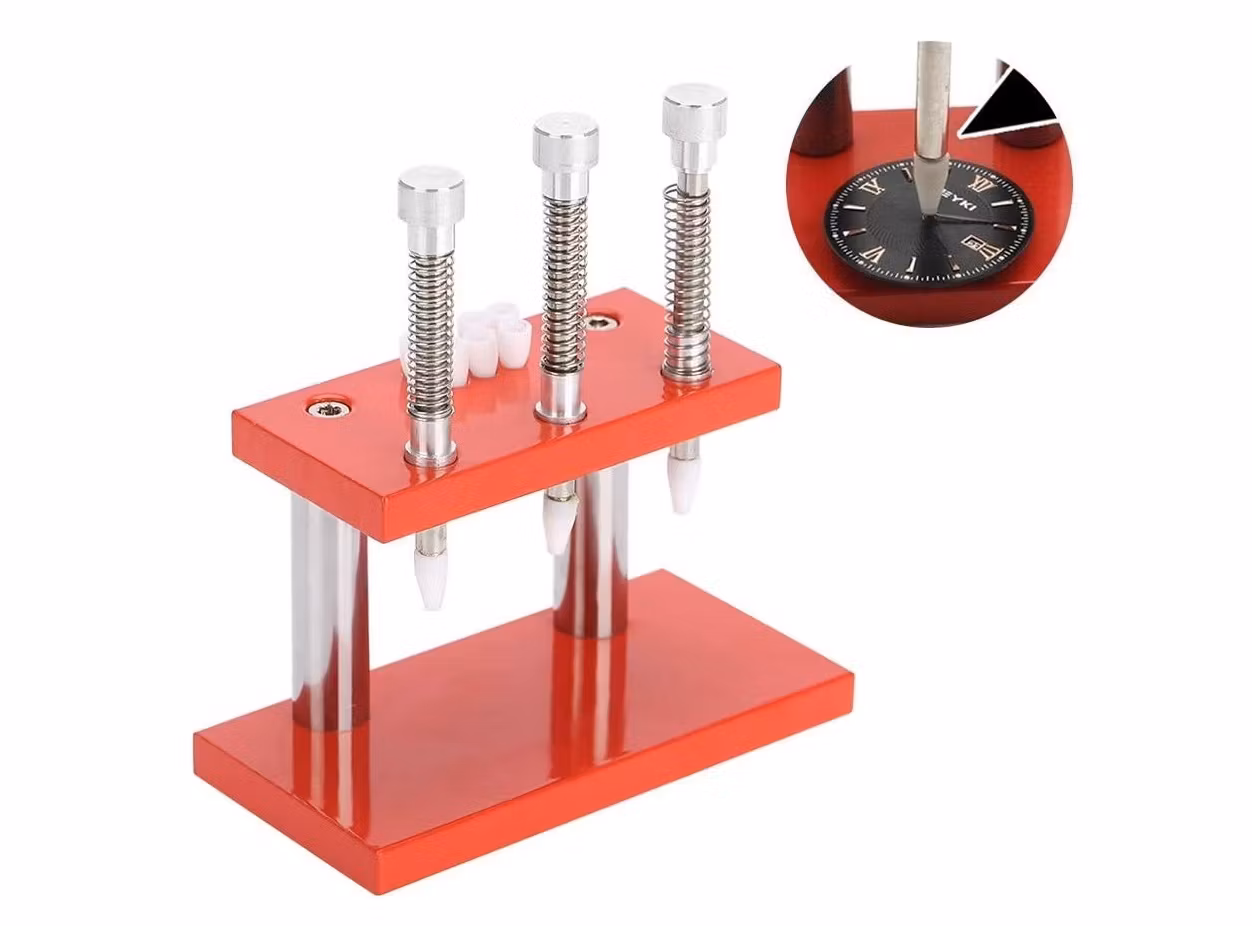 1) Tre vispressar som är ett praktiskt verktyg för att säkert och försiktigt kunna pressa fast/tillbaka visarna. Klockan hålls fast på plats i mittkolven med hjälp av vis press och som hjälper till att skydda och inte skada klockan. Det medföljer 7 stycken plast-toppar (eller don som de också kallas för) och dessa går att byta ut och är också reservdelar. Materialet på vispressen är av rostfritt stål och toppen är av plast. Vikten på vispressen är ca 250 gram.