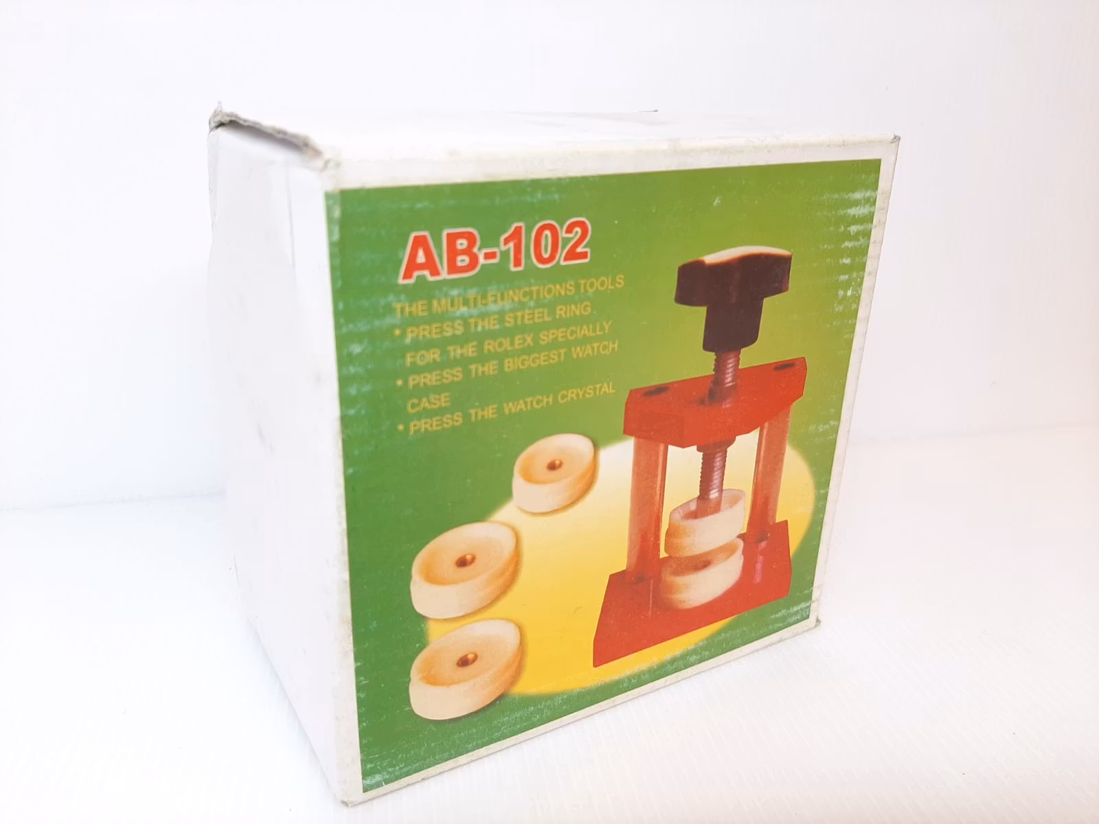 Du köper en boett press (ett verktyg för klocka och urmakeri) samt 12 stycken medföljande press plattor. Denna kraftiga boettpress används för enkel fastsättning av boetter på baksidor av klockor. På det sättet skadar man inte glaset. Pressplattorna är av nylon, för skonsam hantering av glaset. Boettpressen väger ca 700 gram. Produkten kommer i sin förpackning.