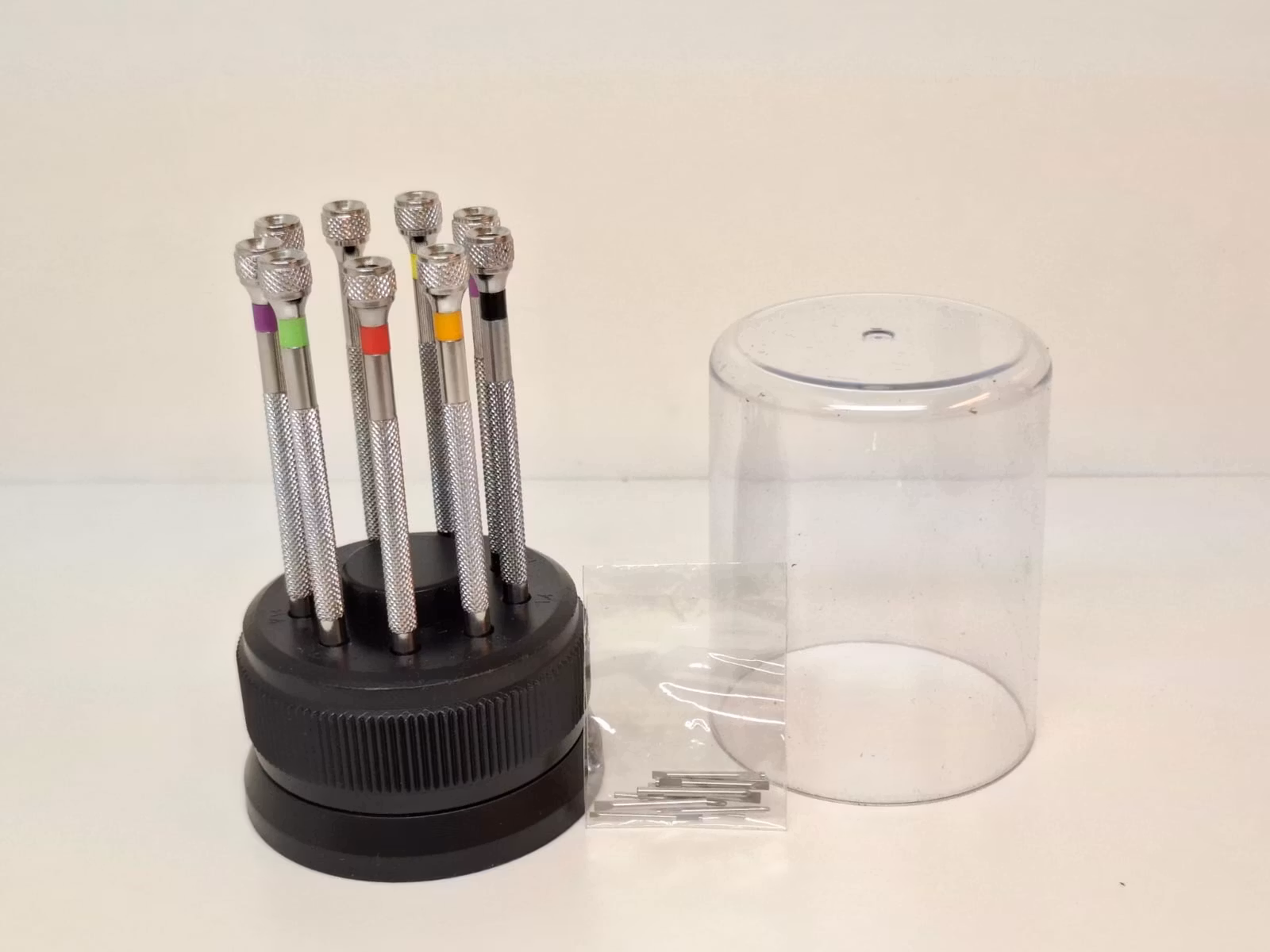 Du köper ett set med 9 stycken skruvmejslar. Dessa verktyg kommer bra till hands för reparation av din klocka / urmakeri. Det ingår ett fint ställ där du kan förvara dessa verktyg på ett praktiskt sätt.