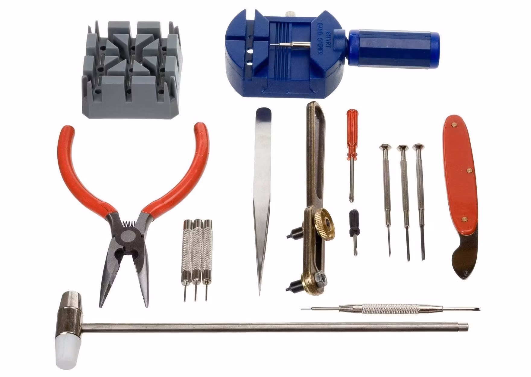 3) Ett bandstiftsverktyg. Detta verktyg används för att byta klockarmband på din klocka snabbt och enkelt. Verktyget har en så kallad svanhals och som används för att enkelt komma åt stiften i klockarmbandet, utan att skada bandet eller klockan.