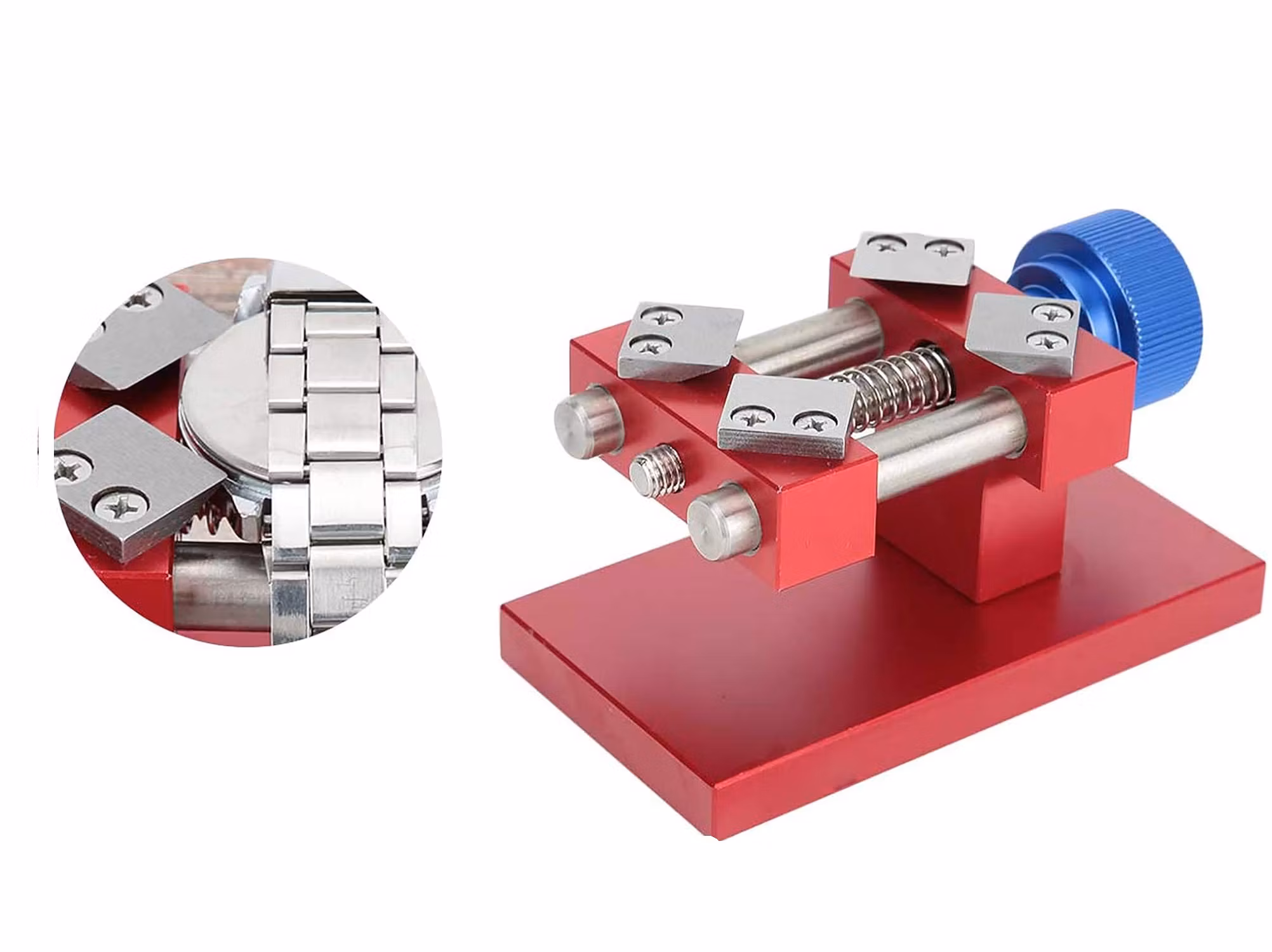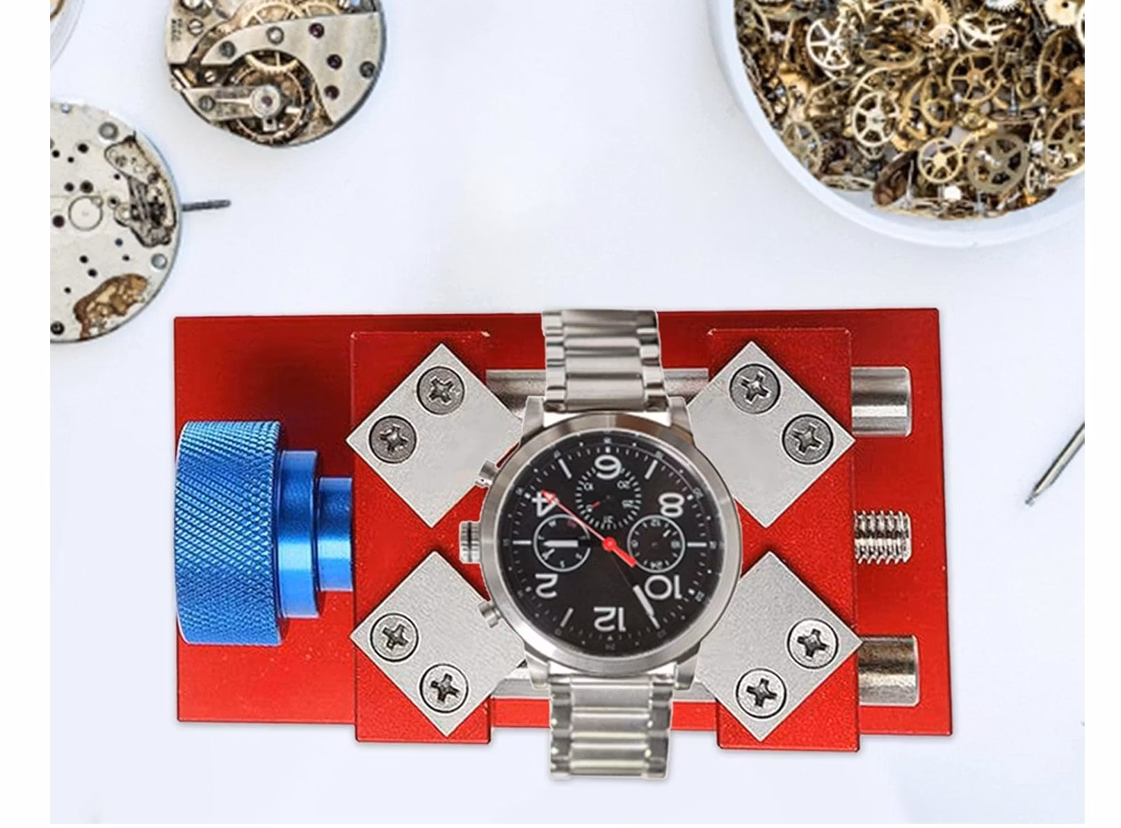 Du köper en praktisk arbetsbänk. Med denna arbetsbänk kan du bland annat spänna fast din klocka på för att utföra reparationer, byta batterier, med mera. Dessutom kan du öppna både boetten på baksidan samt glaset på framsidan på klockan med hjälp av de hårda och tunna metallskivorna som finns placerade på arbetsbänken (notera att klockan bör ha boett och/eller glas som kan öppnas genom tryck och inte snurr eller annat).