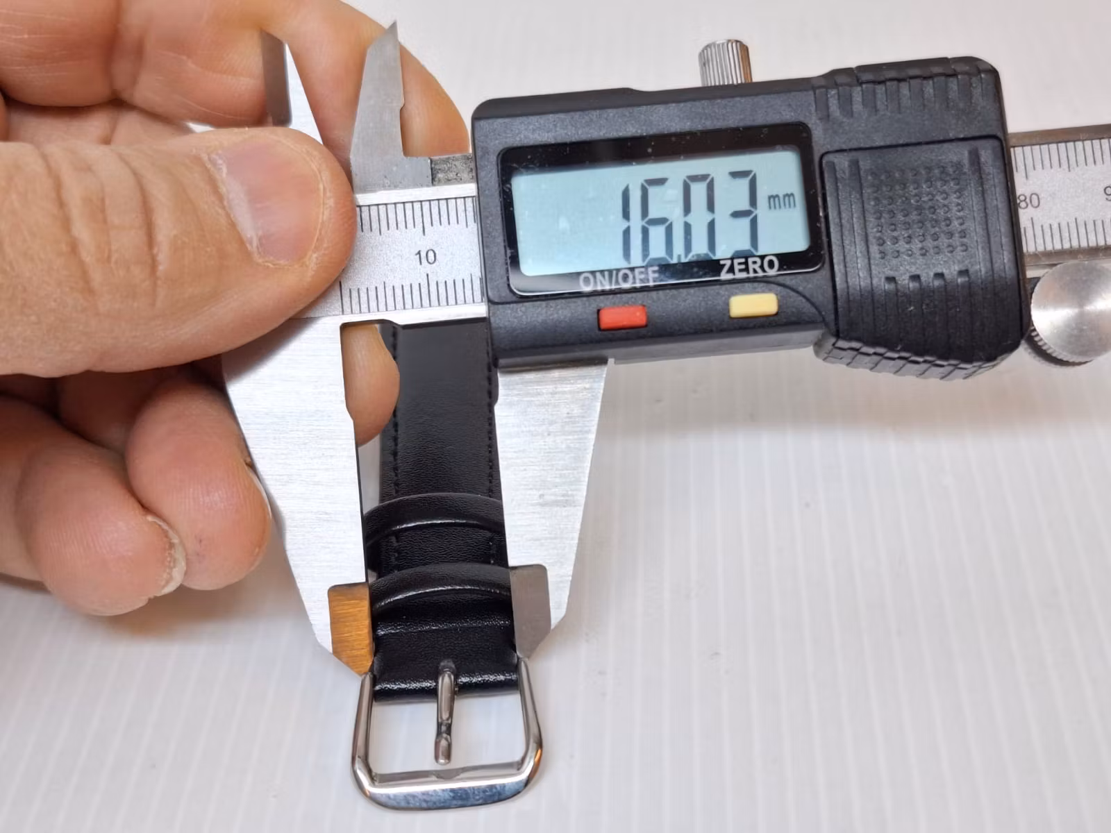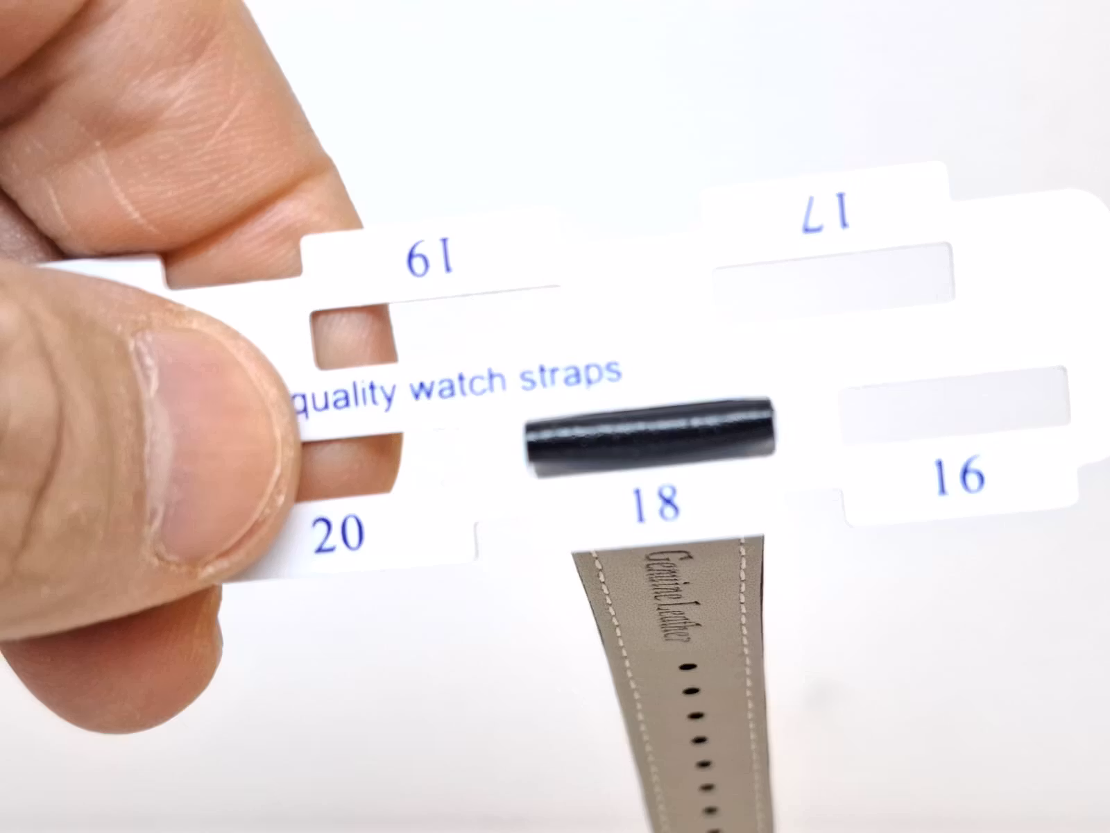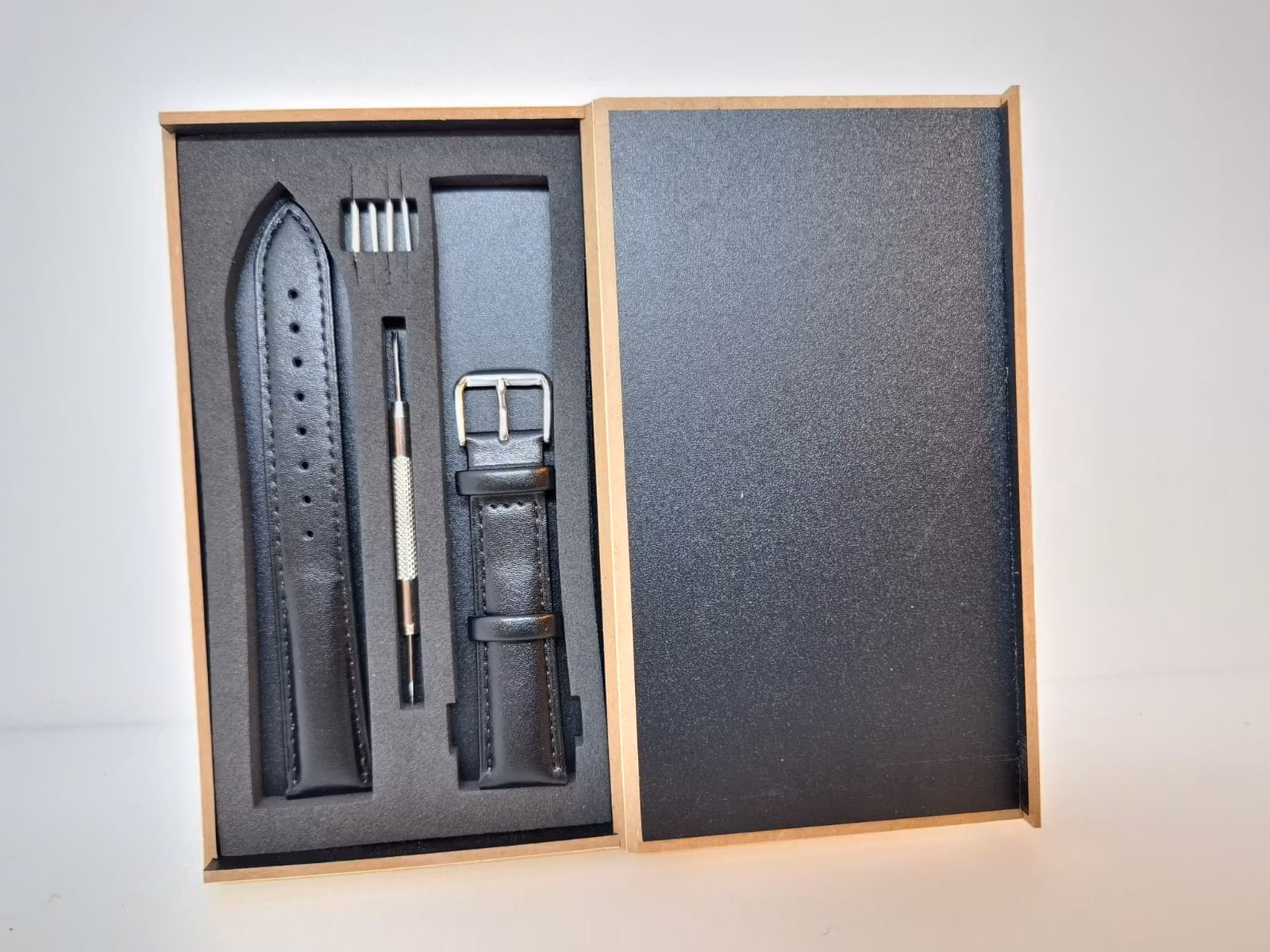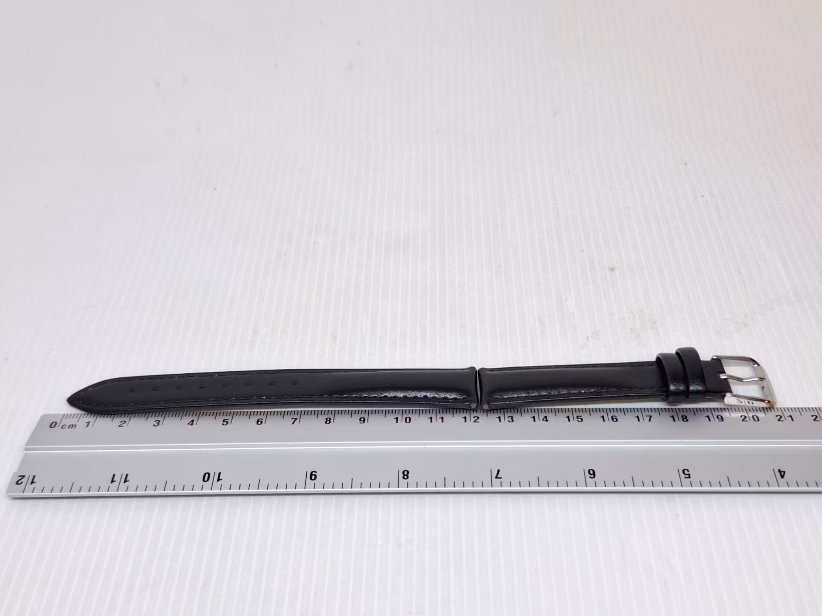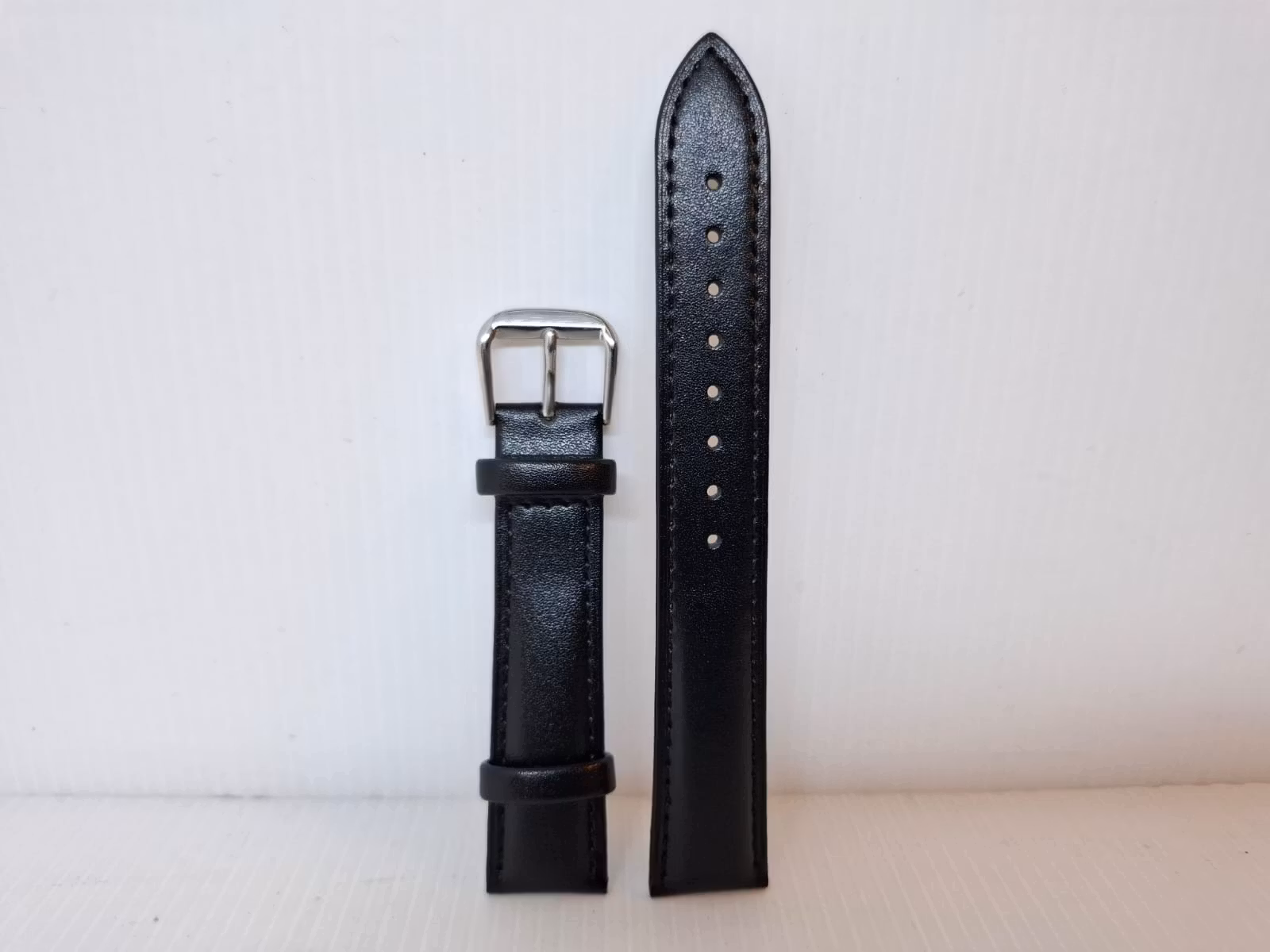 1) Ett armband i svart färg. Armbandet är tillverkad av äkta läder i hög kvalité. Det svarta armbandet har ett spänne i silver färg. Armbandet passar till både dam- och herrklockor. Bredden på armbandet är 18 mm och bredd vid spännet är 16 mm. Längd på armbandet (den långa delen) är ca 12 cm. Längden på armbandet (den korta delen) är ca 9 cm (inklusive spänne, se bild).