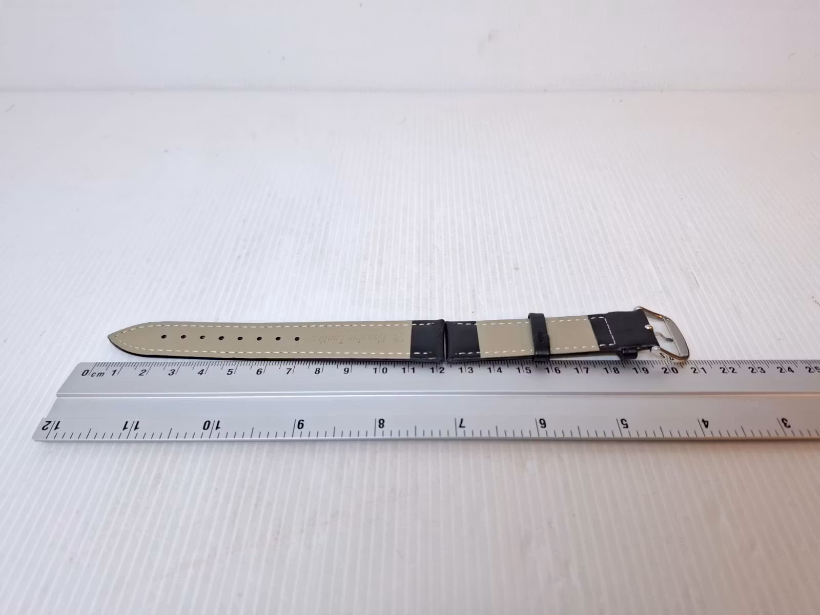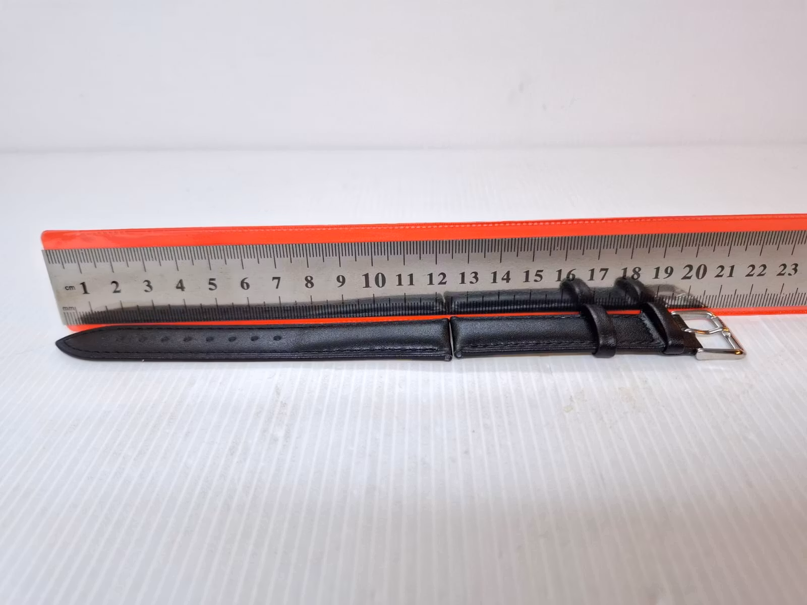 1) Ett armband i svart färg. Armbandet är tillverkad av äkta läder i hög kvalité. Det svarta armbandet har ett spänne i silver färg. Armbandet passar till både dam- och herrklockor. Bredden på armbandet är 19 mm och bredd vid spännet är 17 mm. Längd på armbandet (den långa delen) är ca 12 cm. Längden på armbandet (den korta delen) är ca 9 cm (inklusive spänne, se bild).