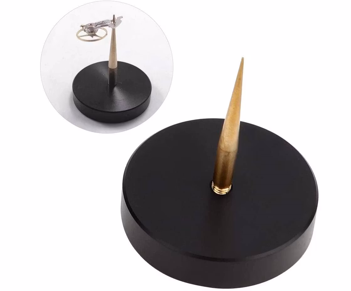 Du köper en balanshållare för klockverktyg. Detta klockverktyg används för att balansera klockmekanismer, reservdelar och annat på. Pinnen/nålen är gjord av mässing och den svarta biten är av hårdplast. Notera att reservdelar o annat som syns på bilderna är endast för visningssyfte och ingår inte i köpet.