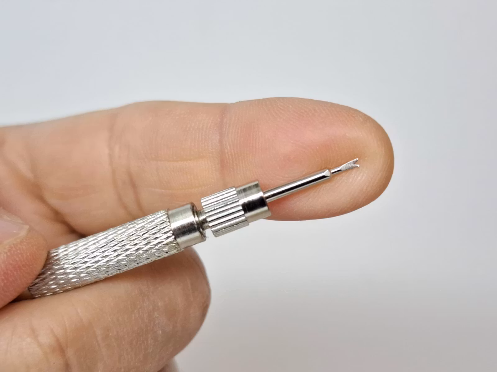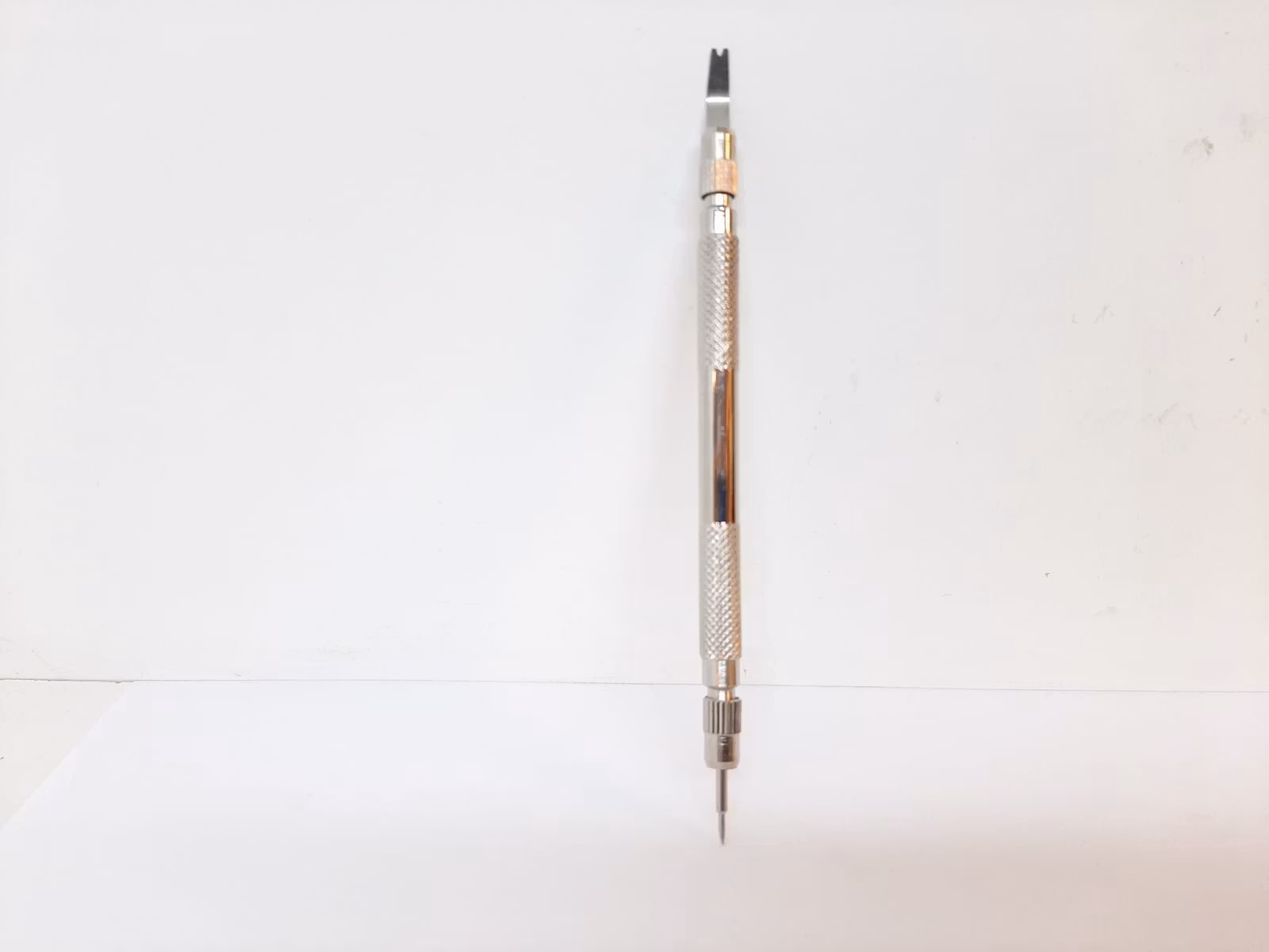 1) Ett praktiskt verktyg, så kallad bandstiftsverktyg. Detta verktyg används för att byta klockarmband på din klocka. Verktyget har en så kallad svanhals och som används för att enkelt komma åt stift utan att skada bandet eller klockan. Det medföljer 6 munstycken. Längd på verktyget: ca 13 cm. Material: Metall