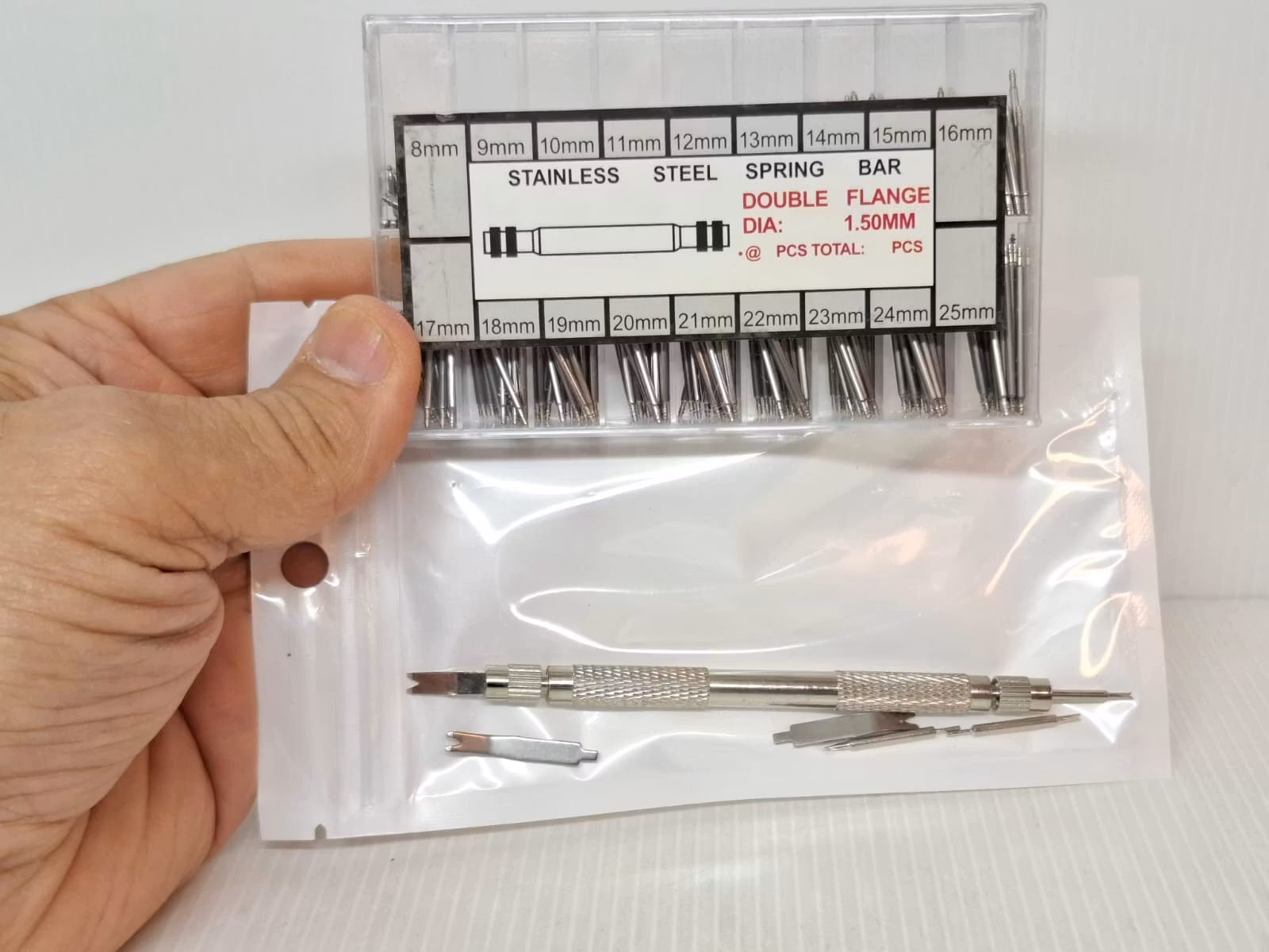 Det innehåller 20 stycken bandstift av varje storlek och diametern är 1.5 mm. De är gjorda av rostfritt stål.