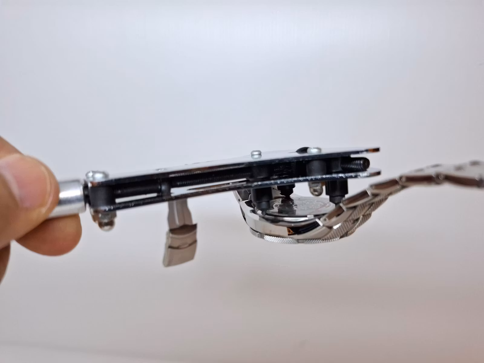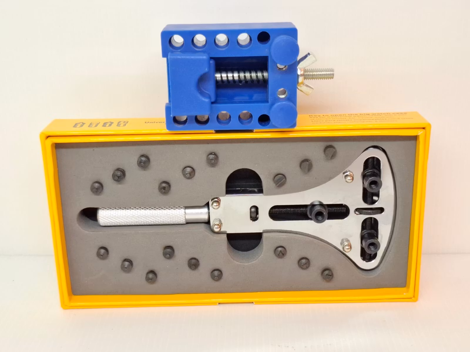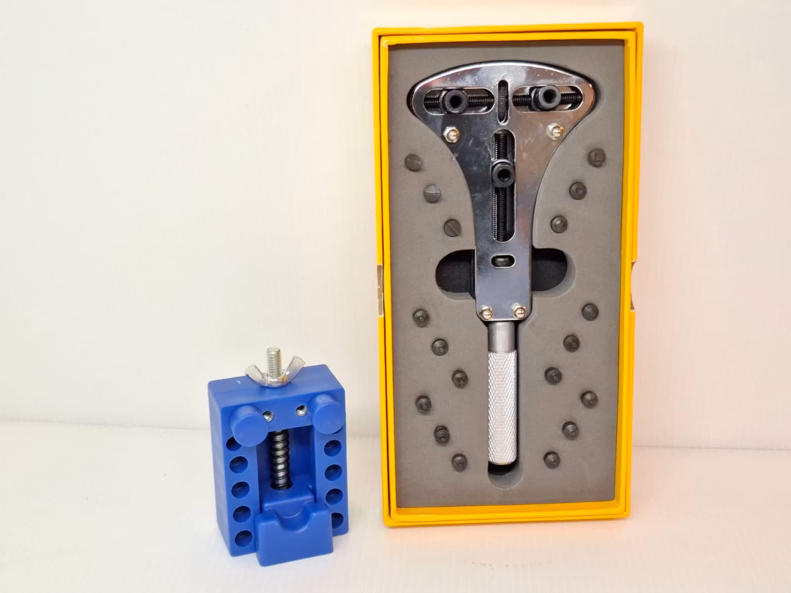 2) Ett skruvstäd i blå färg. Placera din klocka på klockhållaren för att hantera klockan säkert och smidigt när du exempelvis reparerar den, ska öppna boetten, med mera. Med sina plaststift så repas inte klockorna. Skruvstädet har som maxmått för boetter upp till ca 40 mm. Skruvstädet är gjort av plast och metall (skruven).
