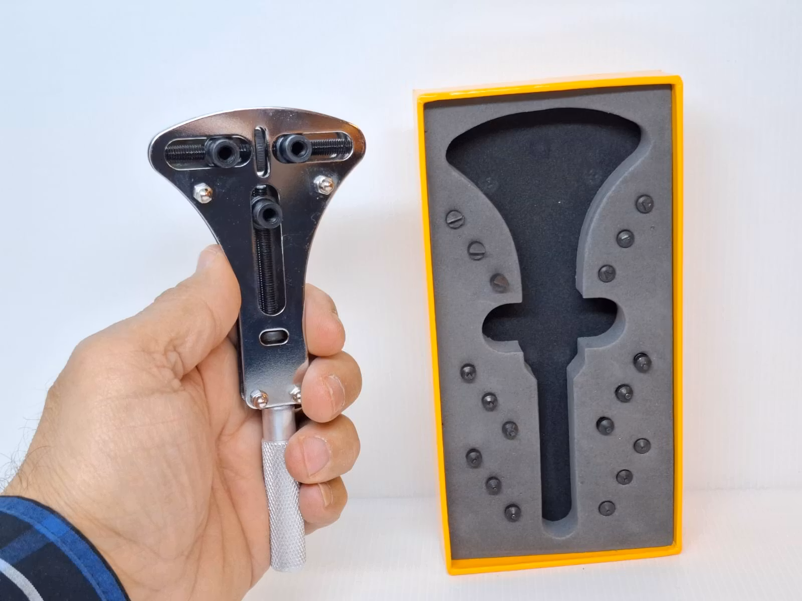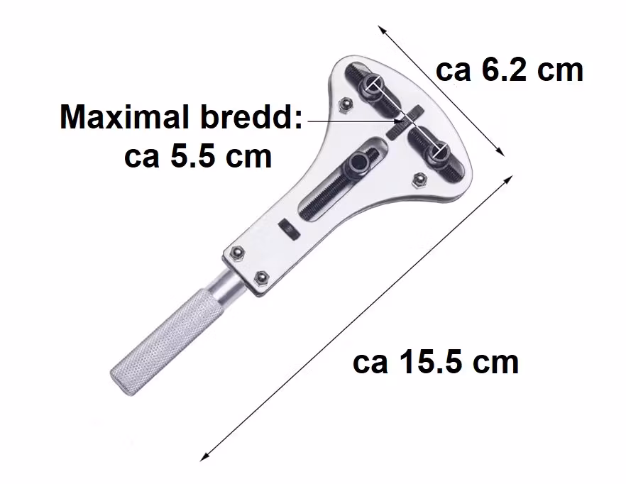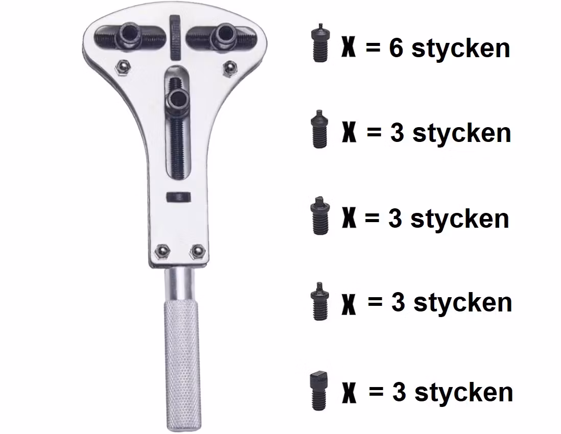 1) En boettöppnare som är justerbar. Ställ in måttet på denna boettöppnare och använd den för att snurra av boetten på klockan. Måtten som går att ställa in går allt från ca 15 millimeter till ca 55 millimeter i diameter för boetter. Den är till för klockor och urverk med gängade boetter. Det medföljer 18 olika munstycken / bits som byts ut beroende på boettens form. Munstyckenas storlekar är 3 stycken platta, 3 stycken fyrkantiga, 3 stycken trianglar och 9 stycken runda. Boettöppnaren är gjord av metall och kommer i sin förpackning. Boettöppnarens vikt: ca 150 gram