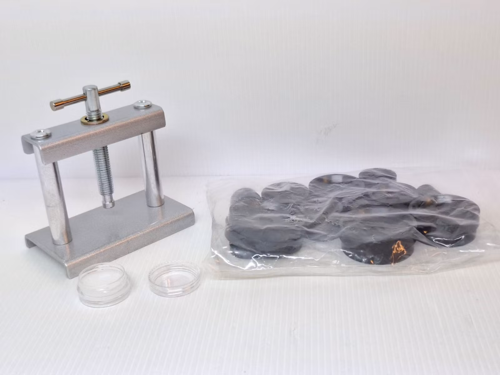 Det medföljer 12 stycken pressplattor samt en liten plastburk som innehåller smörjningsmedel, och som är ämnad för O-ringarna (alltså gummiringarna som sitter runt boetten på klockan. Smörj O-ringen genom att dra den mot smörjmedlen i plastburken. Detta förlänger O-ringens hållbarhet samt kvalité, för att undvika uttorkning, skador samt att den inte ska gå av.
