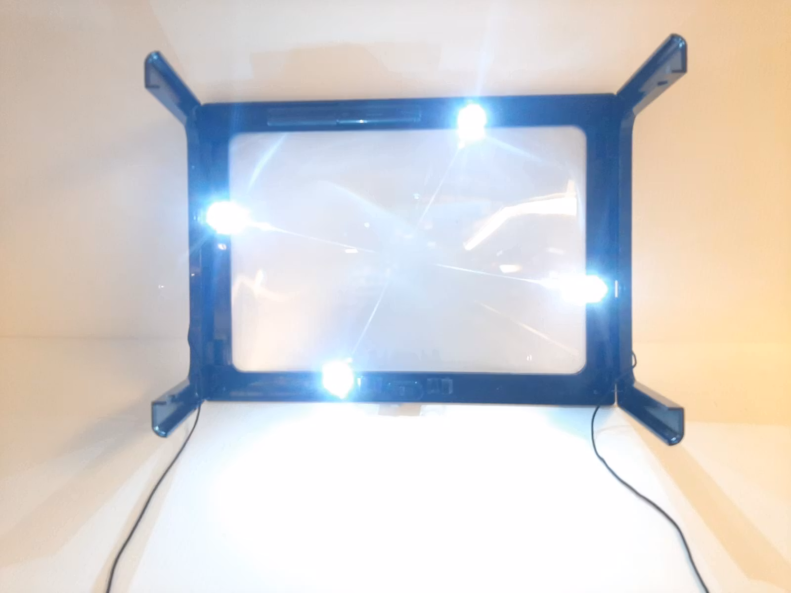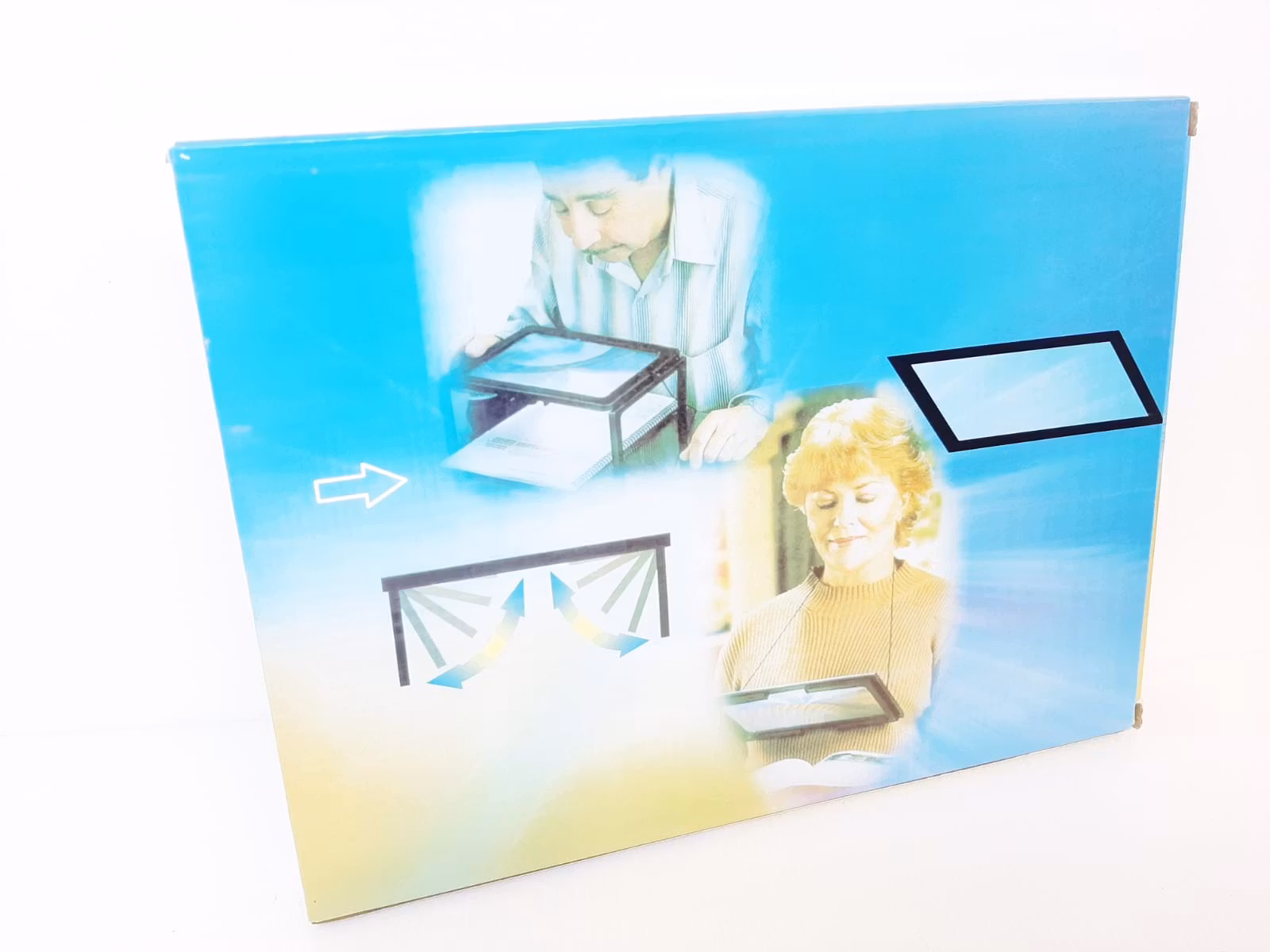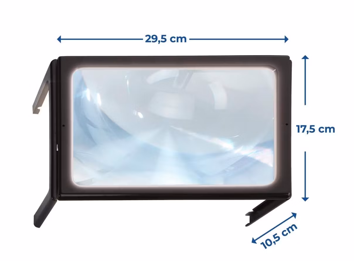 Förstoringsplattan förstorar upp till 3 gånger (x3) och har även fyra stycken energieffektiva LED-lampor som drivs av två stycken AA-batterier. Förstoringsglaset går att fälla ihop (se bilder). Produkten är tillverkad av ABS-plast.