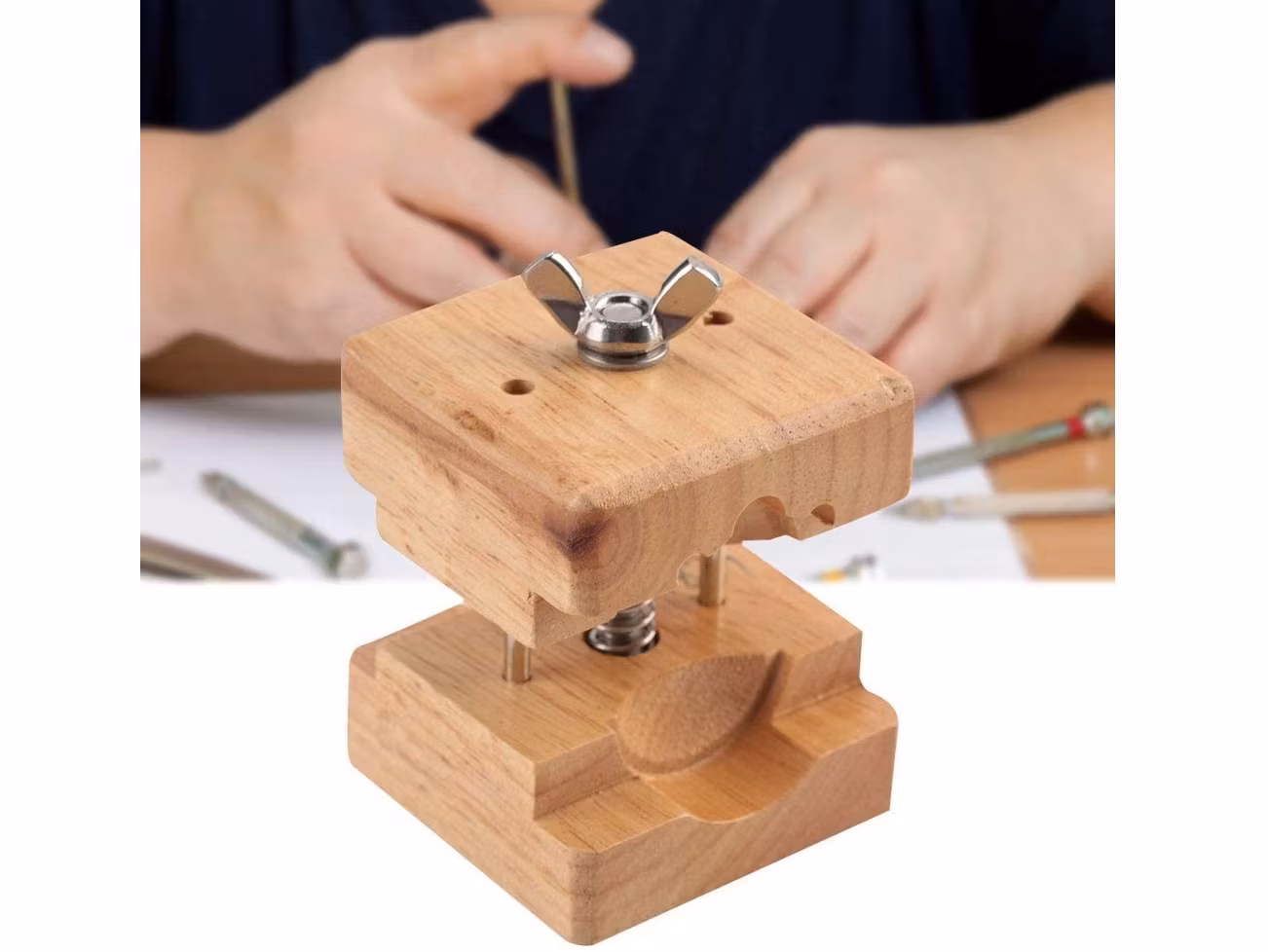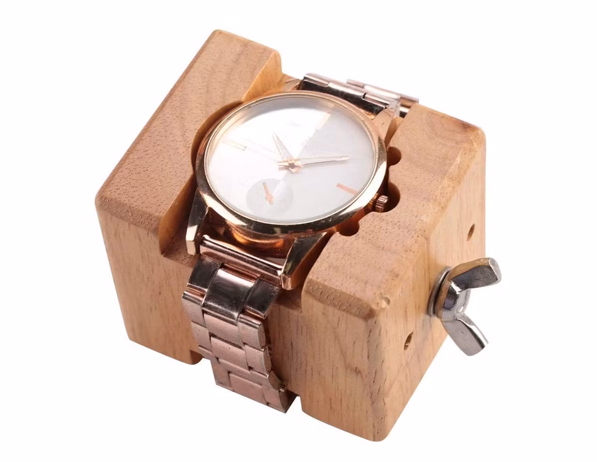 Du köper en justerbar hållare som spänner fast klockan. Placera din klocka på klockhållaren för att hantera klockan säkert och smidigt när du exempelvis reparerar den. Med den finslipade träytan så repas inte klockorna. Hållaren kan ställas in i olika positioner för olika storlekar. Klockan på bilden är endast för visningssyfte och ingår inte i köpet.
