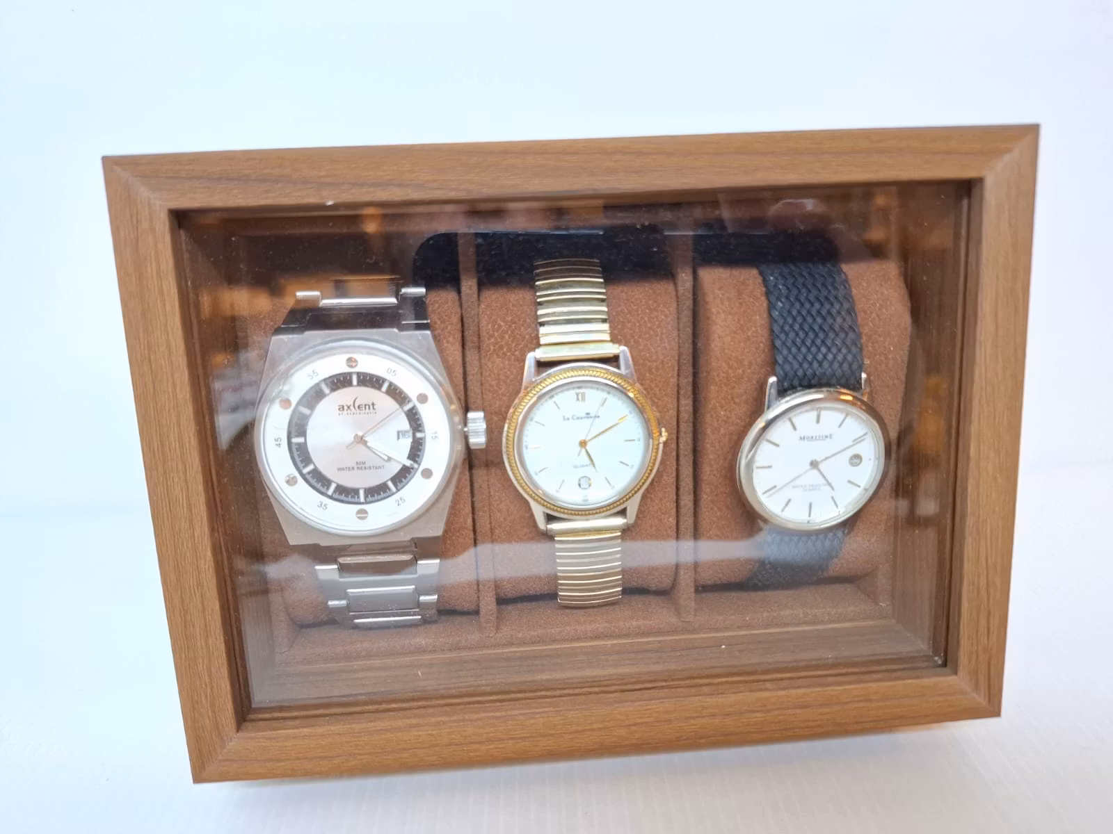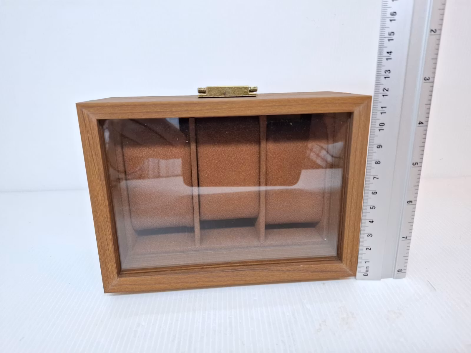 Du köper en klocklåda som är tillverkad av trä. Den har plats för tre klockor. Kuddarna är gjorda av len tyg. Lådan kommer i en kartong.