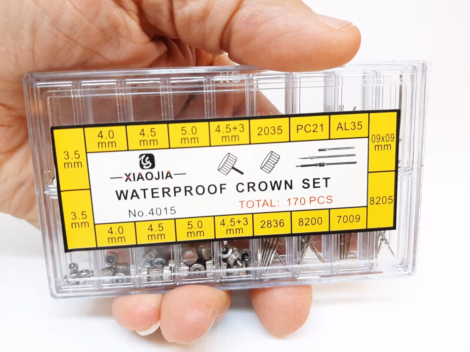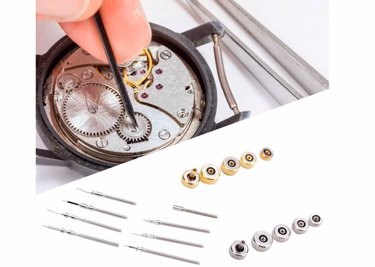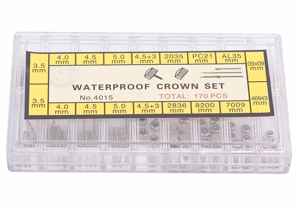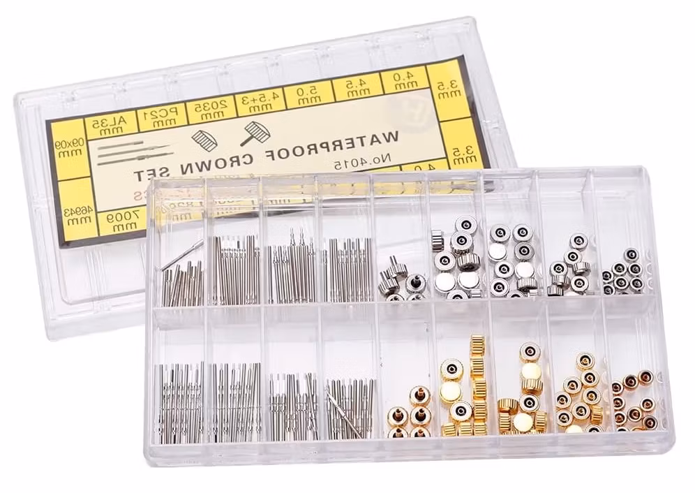 Du köper en ask som innehåller totalt 170 reservdelar som består av krondelar och sprint. Kronorna är tillverkade i metall och kommer i 5 olika storlekar (i guld och silver färg). Sprinten (som också kallas för klockstift) har dubbla flänsar och är ämnade för klockor med metallarmband.
