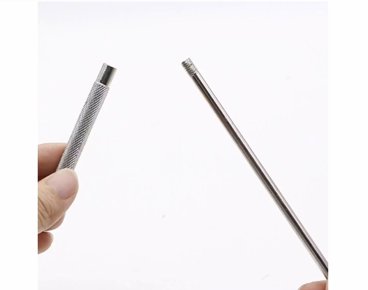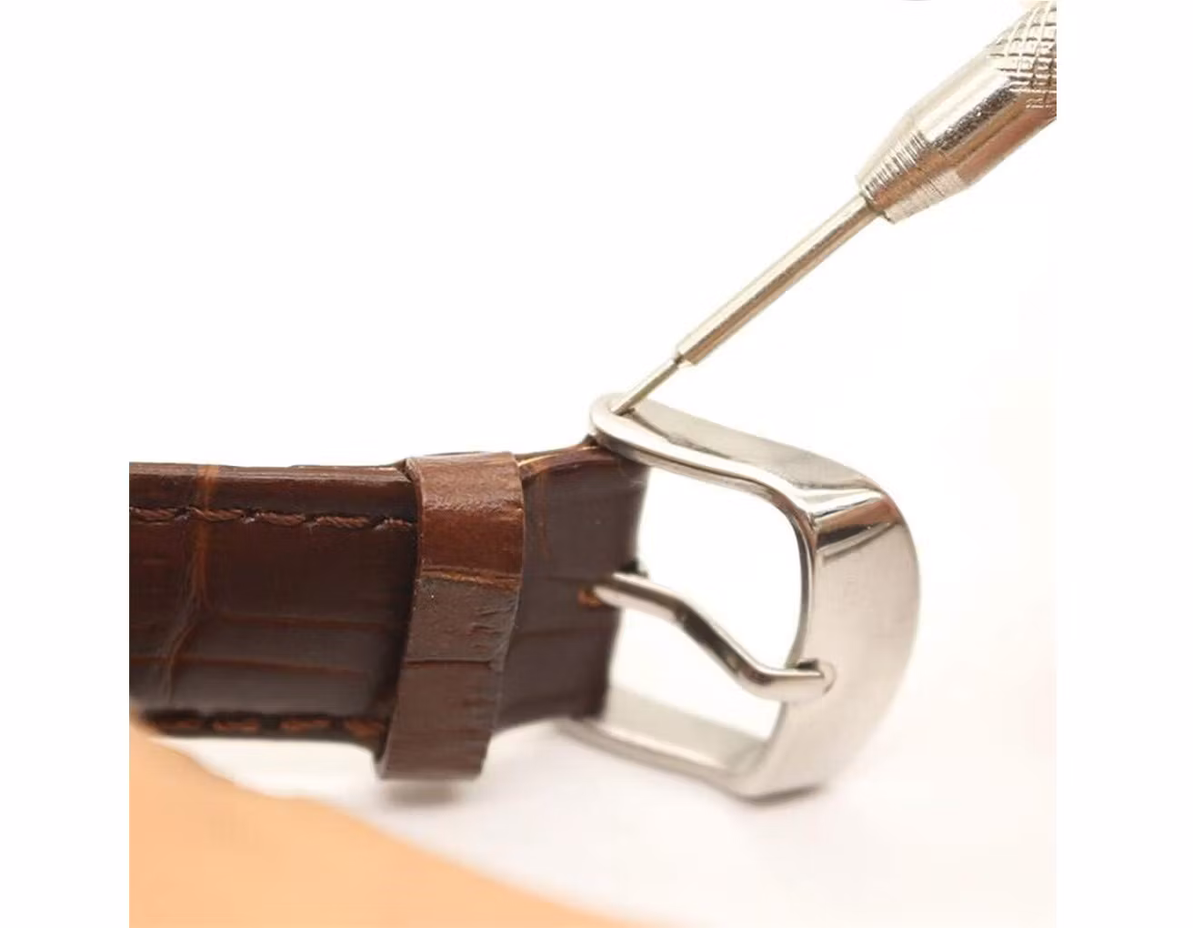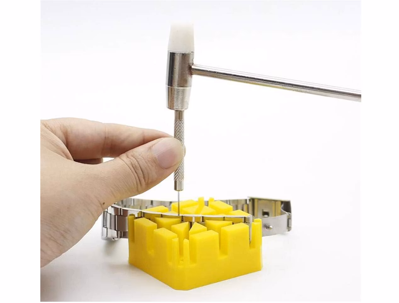 5) Ett bandstiftsverktyg. Detta verktyg används för att byta klockarmband på din klocka snabbt och enkelt. Du kan använda det skruvbara greppet som medföljer hammaren och skruva fast den i bandstiftsverktyget för att göra den längre.