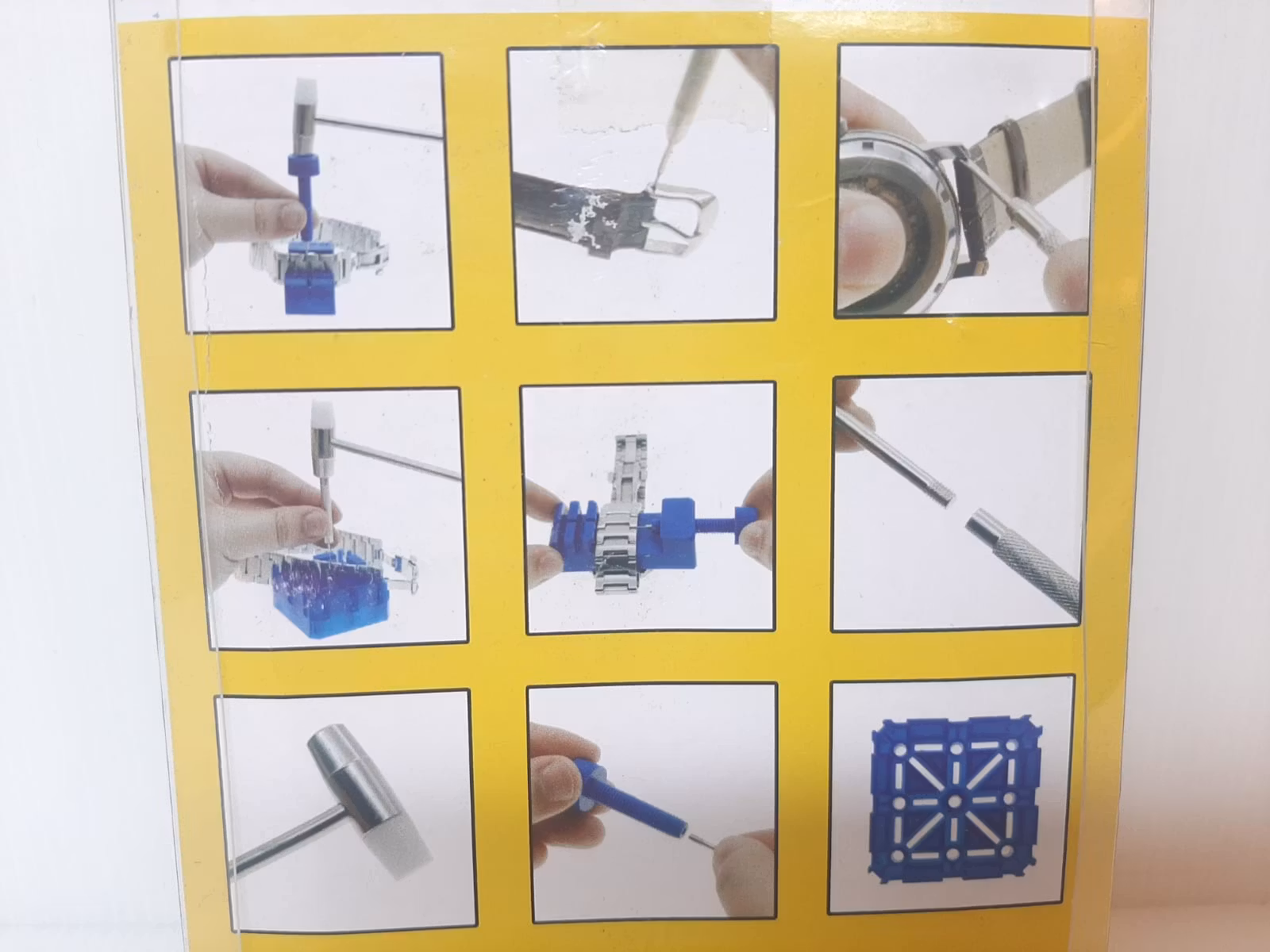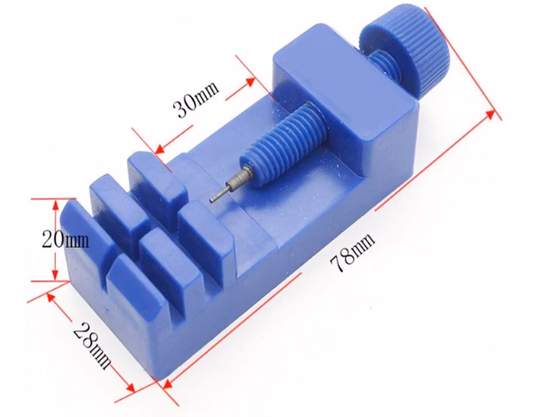 1) En Länkborttagare som kommer i blå färg. Placera klockan på borttagaren och använd nålen för att ta bort bandstiften från klockarmbandet.