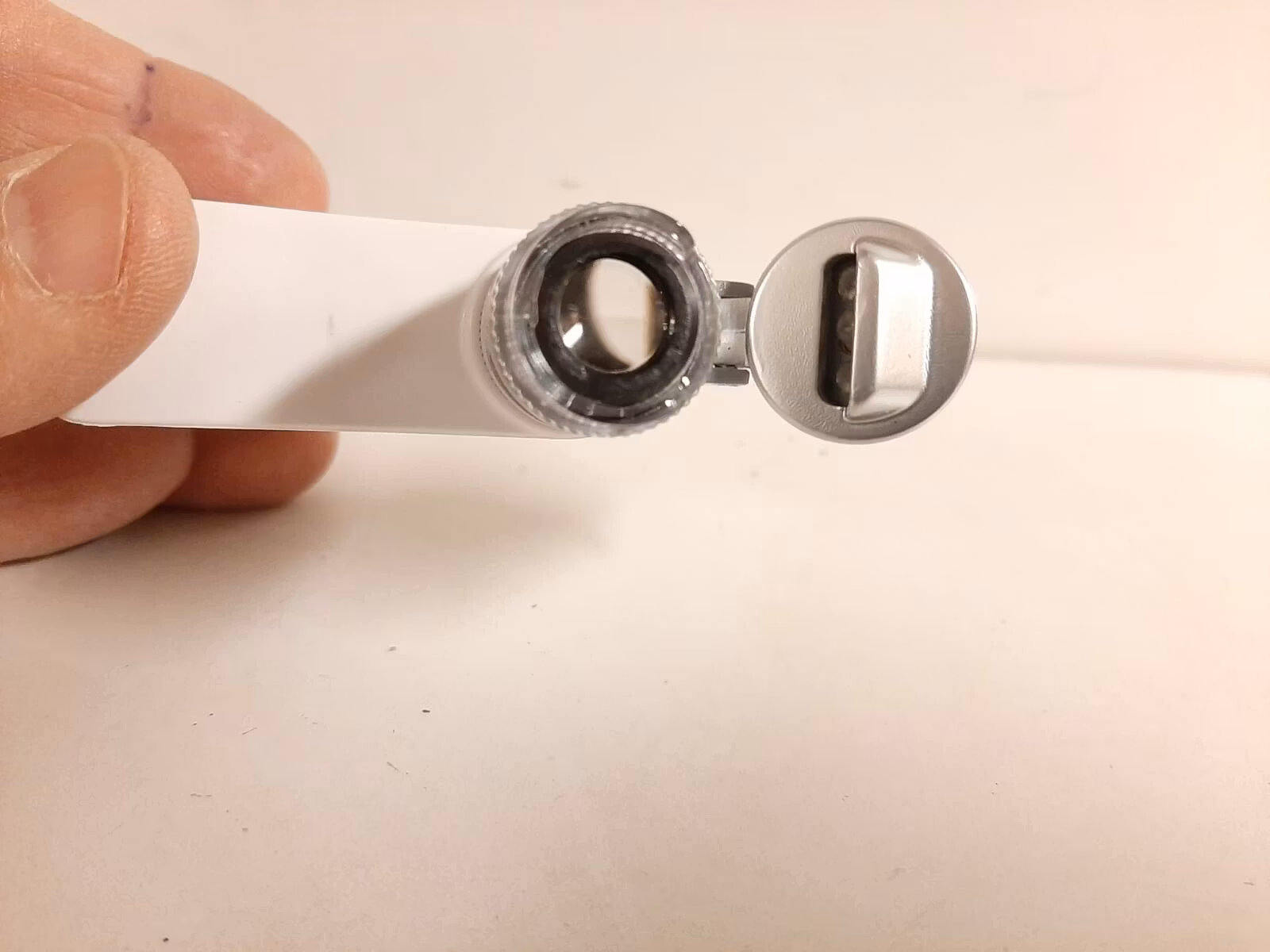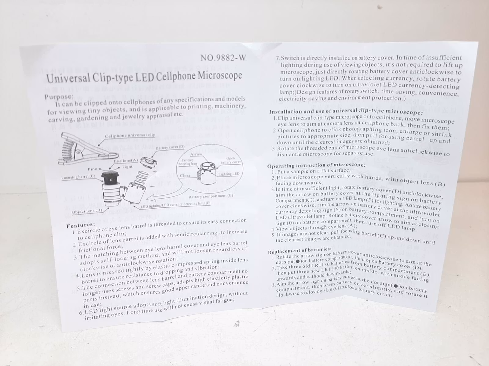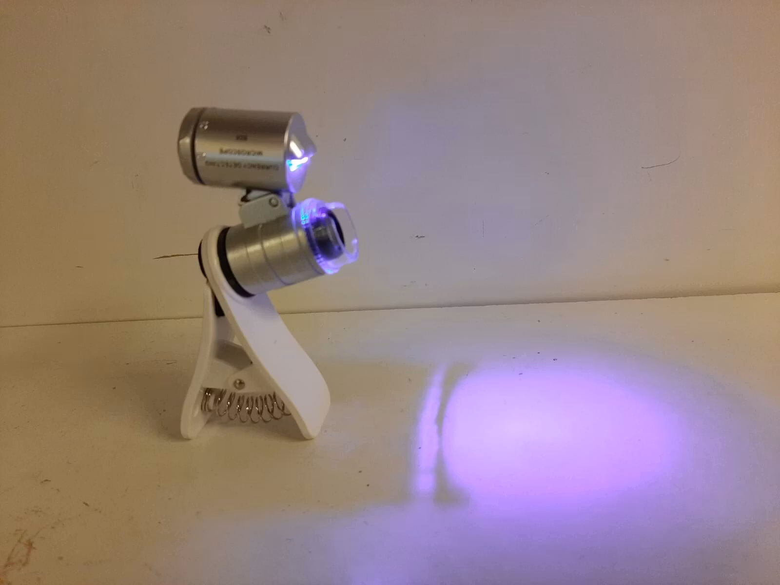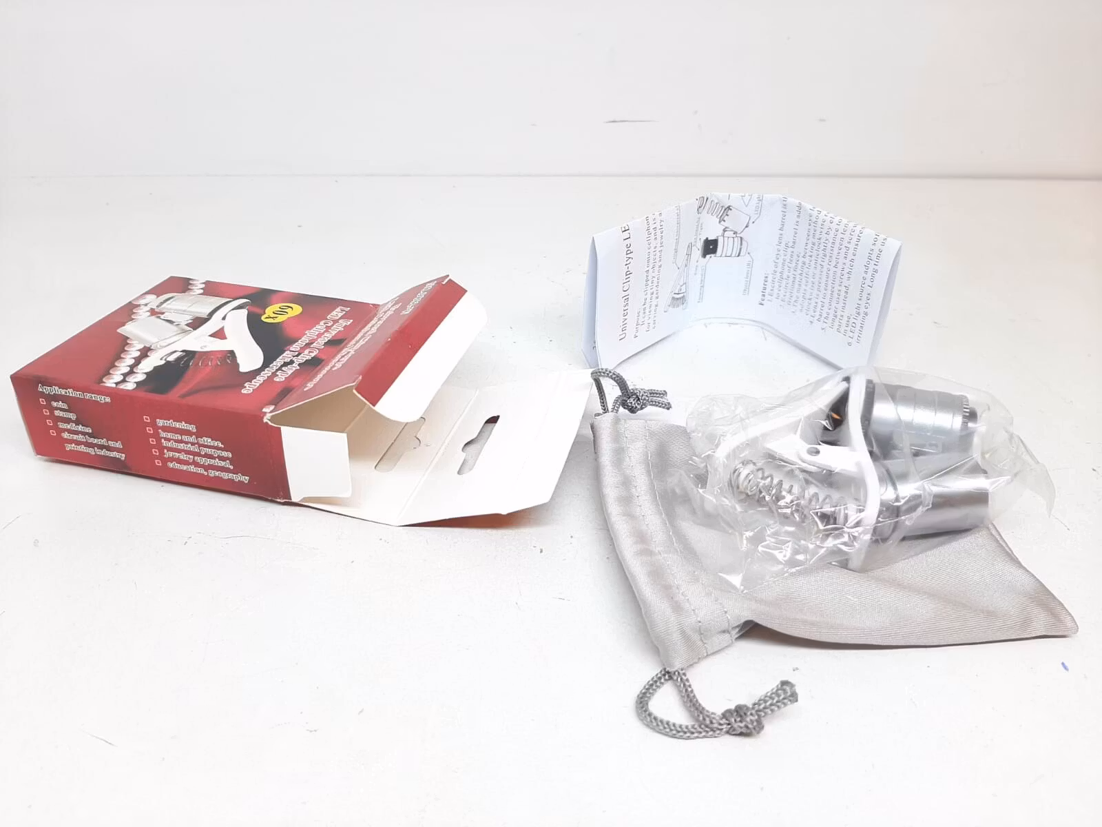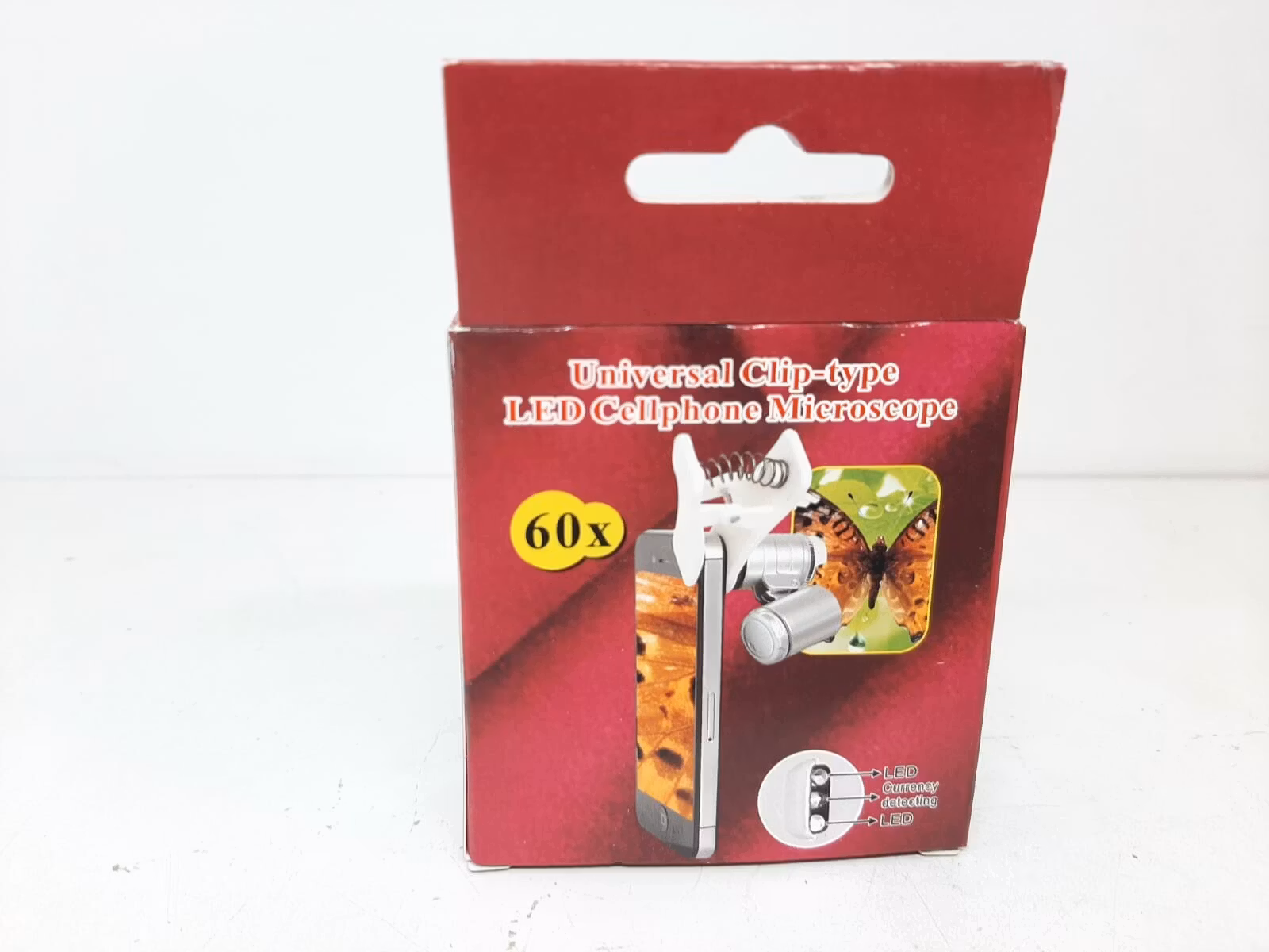 Den portabla mikroskopet förstorar upp till 60 gånger. Den är universal och passar till de flesta mobiltelefoner. Den har även två inbyggda LED-ljus (ett vanligt ljus och ett rosa/lila ljus som bland annat kan användas när man tittar på sedlar). Batterier ingår. Mikroskopet kommer i originalförpackning där tygväska och manual medföljer.