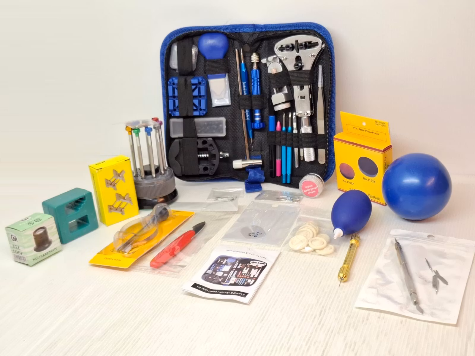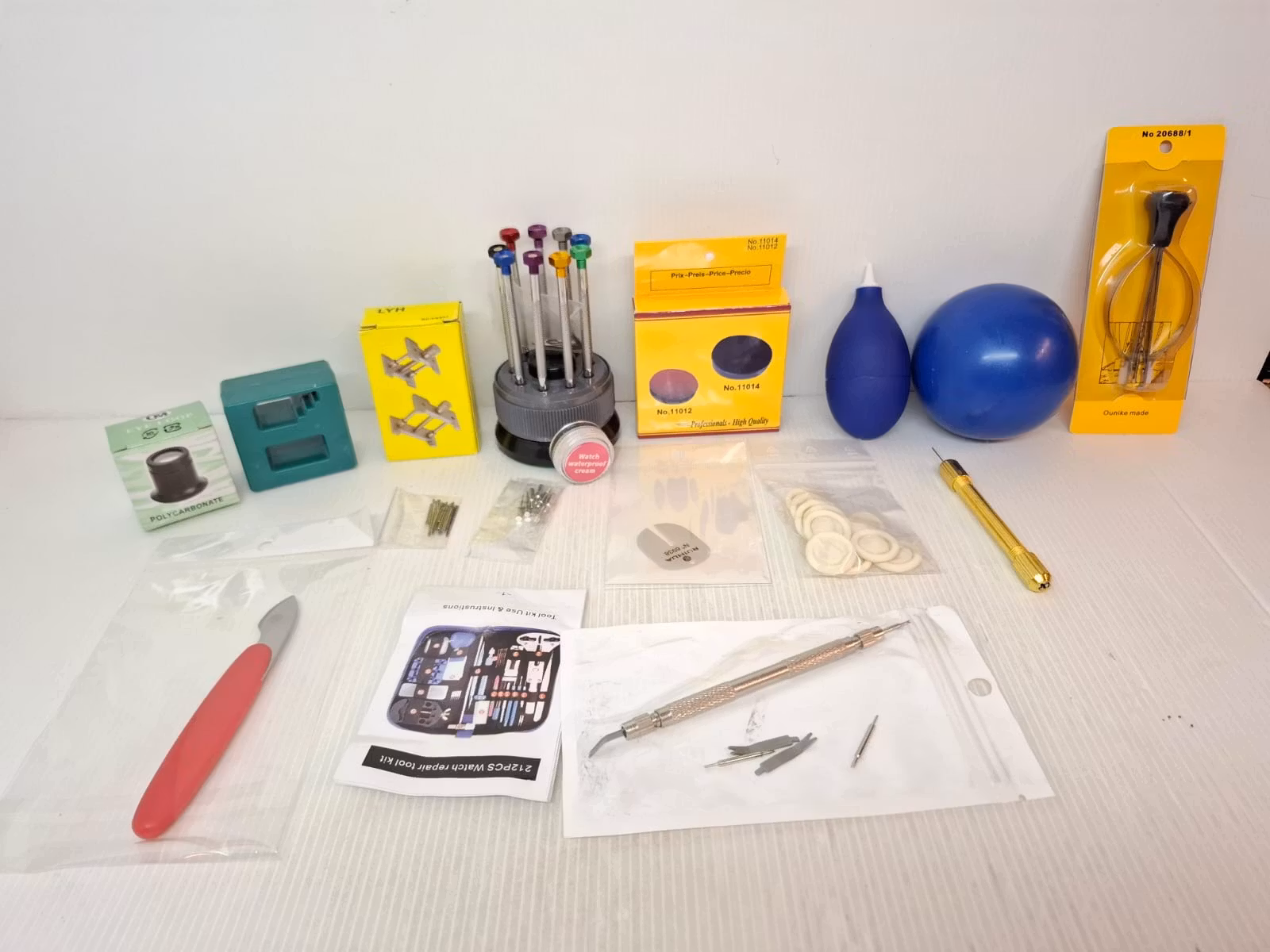 Du köper en verktygssats som innehåller totalt 20 olika praktiska verktyg för reparationer och underhåll av klocka och urmakeri. Verktygen kommer i en väska med dragkedja. Du köper följande verktyg: