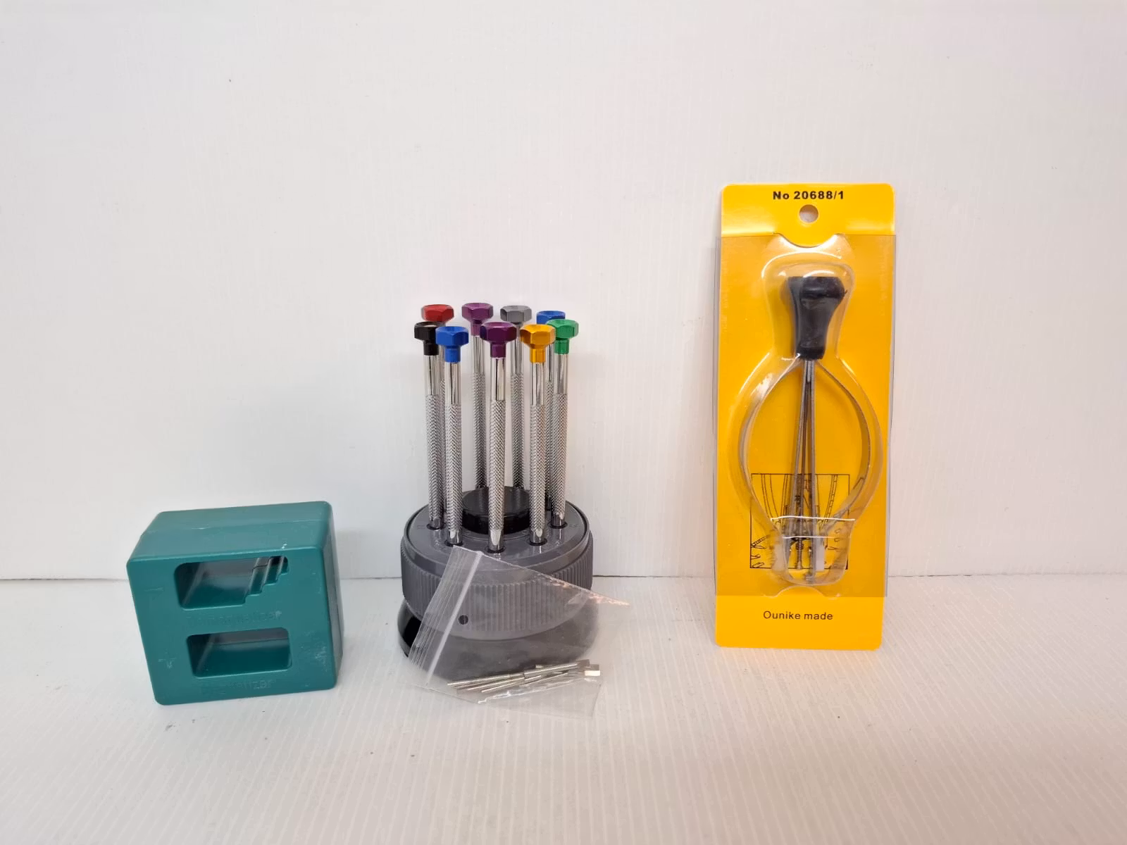 28) Ett set med 9 stycken skruvmejslar. Dessa verktyg kommer bra till hands för reparation av din klocka / urmakeri. Det medföljer ett praktiskt ställ där du kan förvara dessa verktyg på ett praktiskt sätt. Setet består av 7 st spårmejslar och 2 st stjärnmejslar (totalt 9 mejslar).