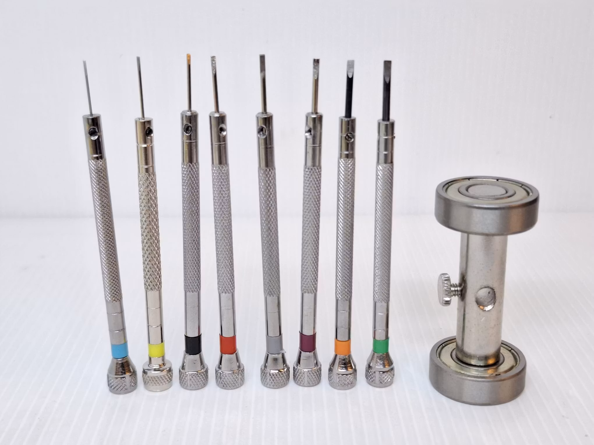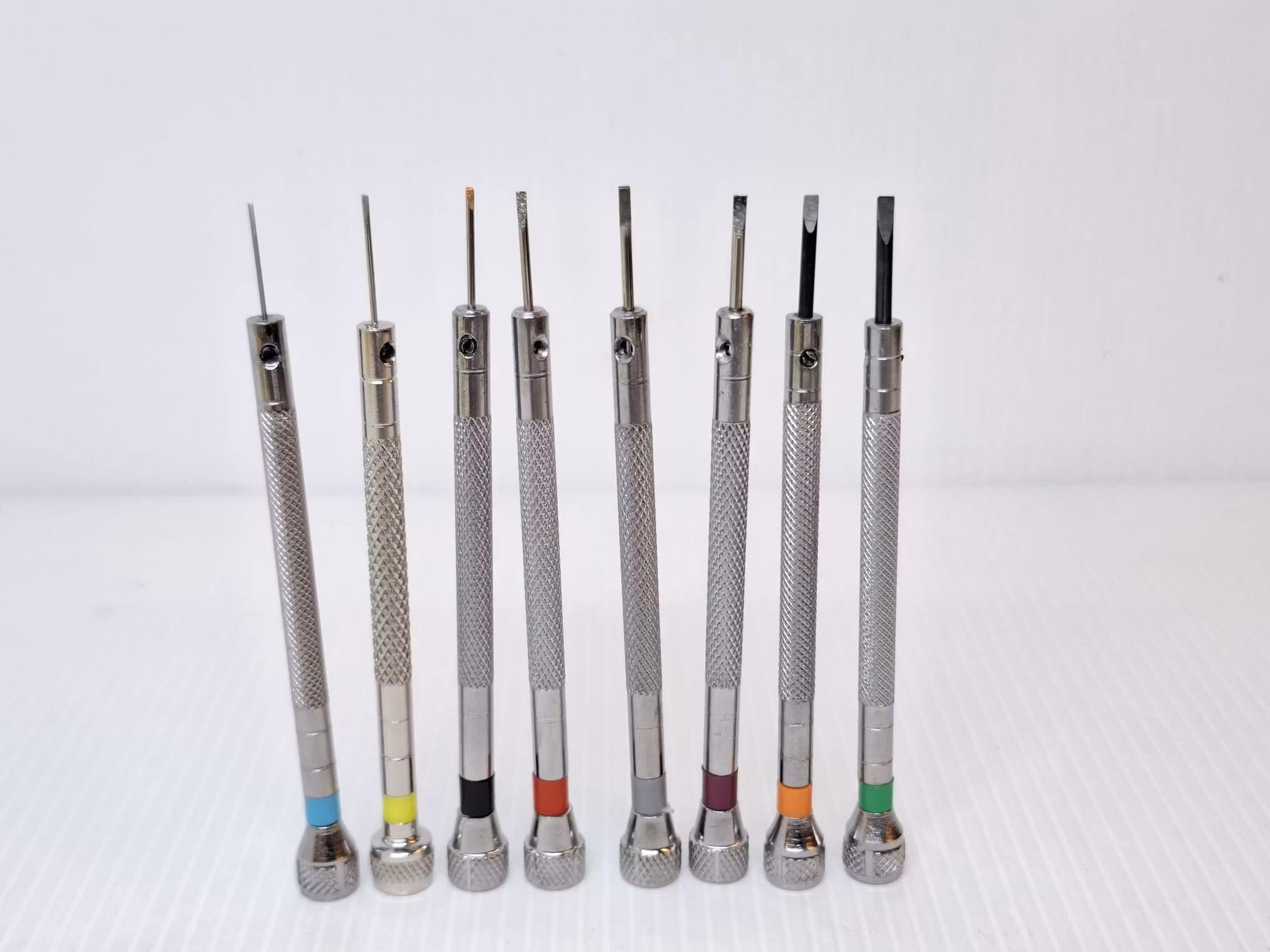 Du köper ett set som innehåller åtta skruvmejslar (spårmejslar) och ett hjälpverktyg som används när man behöver slipa skruvmejslarna. Hjälpverktyget, som också kallas för vässare, kommer väl till hands när man behöver ha stöd under slipandet/vässandet av skruvmejslar som har tagit skada eller tappat precision. Det man först behöver göra är att placera skruvmejseln som ska vässas in igenom hålet på hjälpverktyget. Sedan spänner man skruvmejseln med skruven ovanpå hjälpverktyget. Då sitter mejseln fast riktigt hårt. Sedan så böjer man toppen av mejseln upp och ner på en slipsten.