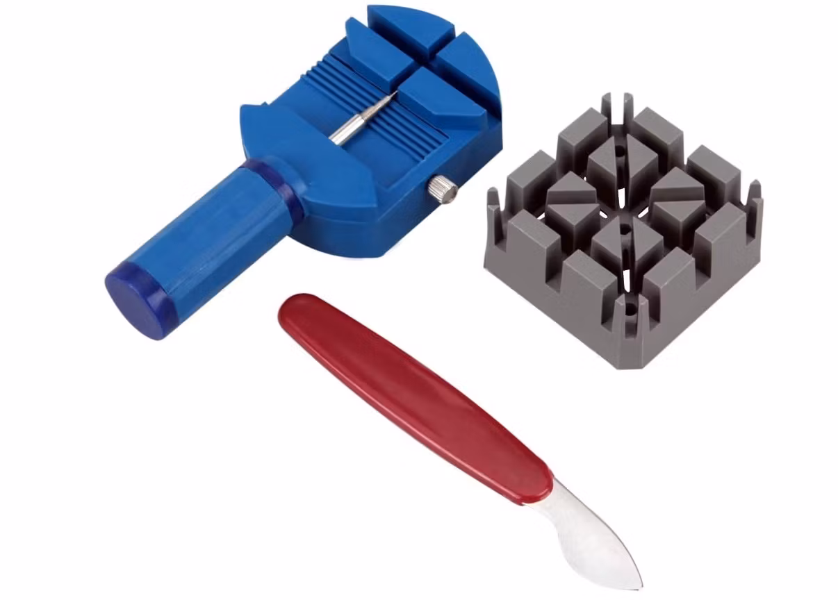 1) En Länkborttagare som kommer i blå färg. Placera klockan på borttagaren och använd nålen för att ta bort bandstiften från klockarmbandet.