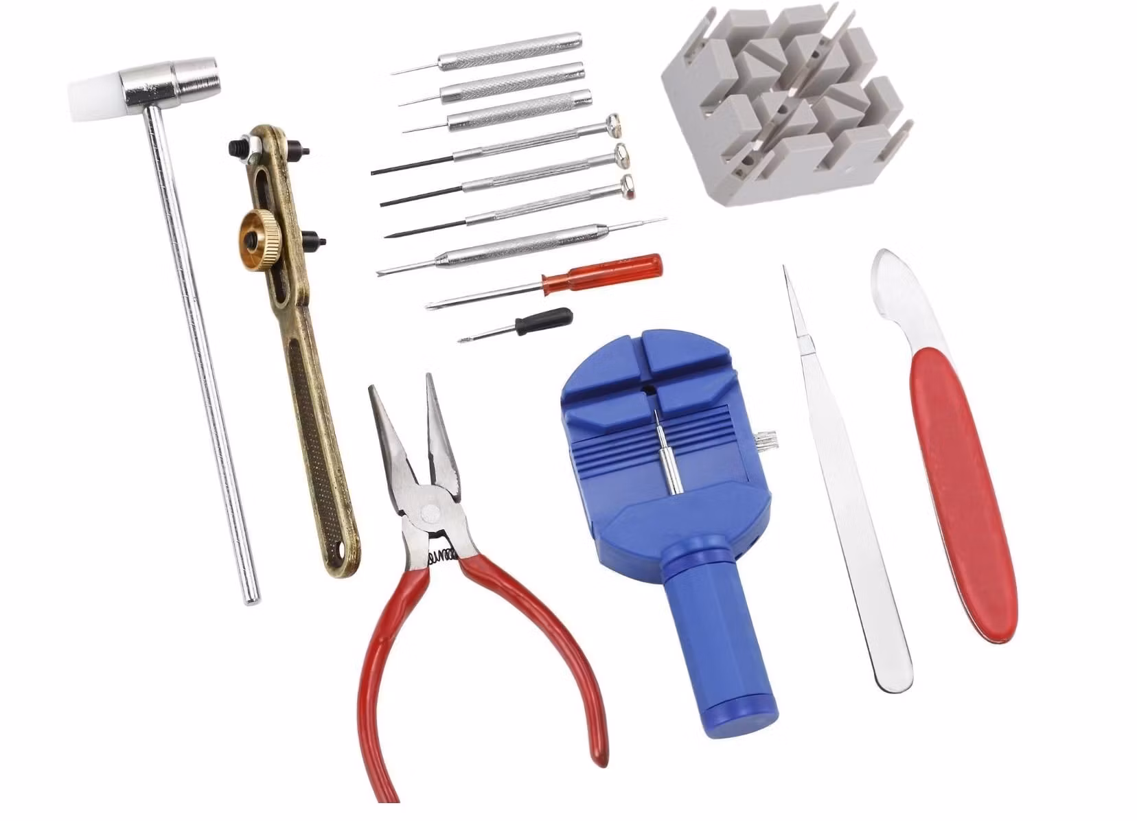 Du köper ett set som innehåller 16 stycken verktyg som är praktiska att använda för reparation och underhåll av klockor och urmakeri. Det medföljer även två klockarmband (ett svart och ett brunt).