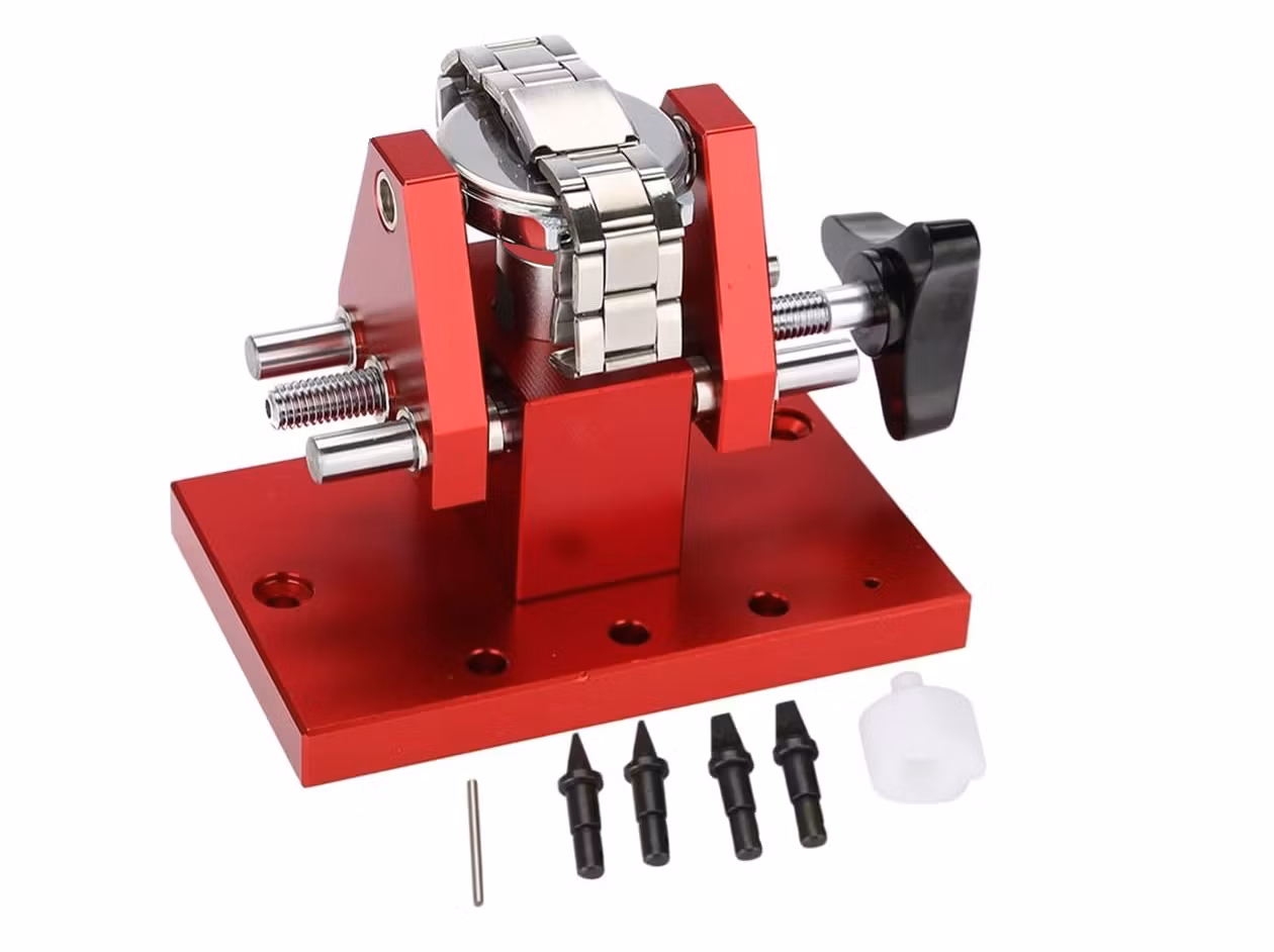 Du köper ett verktyg som fungerar som en boettöppnare men också som en arbetsbänk för att kunna utföra reparationer och annat underhåll av klockor och urmakeri. Det medföljer fyra olika munstycken som fungerar som boettöppnaren. Välj det munstycke som passar din klocka bäst och placera munstycket inne i arbetsbänken. Placera sedan klockan på stolpen i mitten av arbetsverktyget och snurra/vrid sedan försiktigt på det svarta snurrhandtaget tills munstycket träffar boettkanten. Snurra vidare för att sedan få upp boetten.