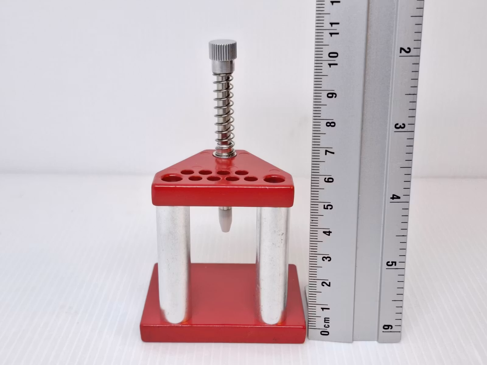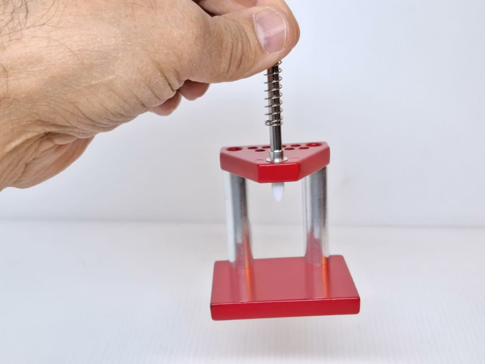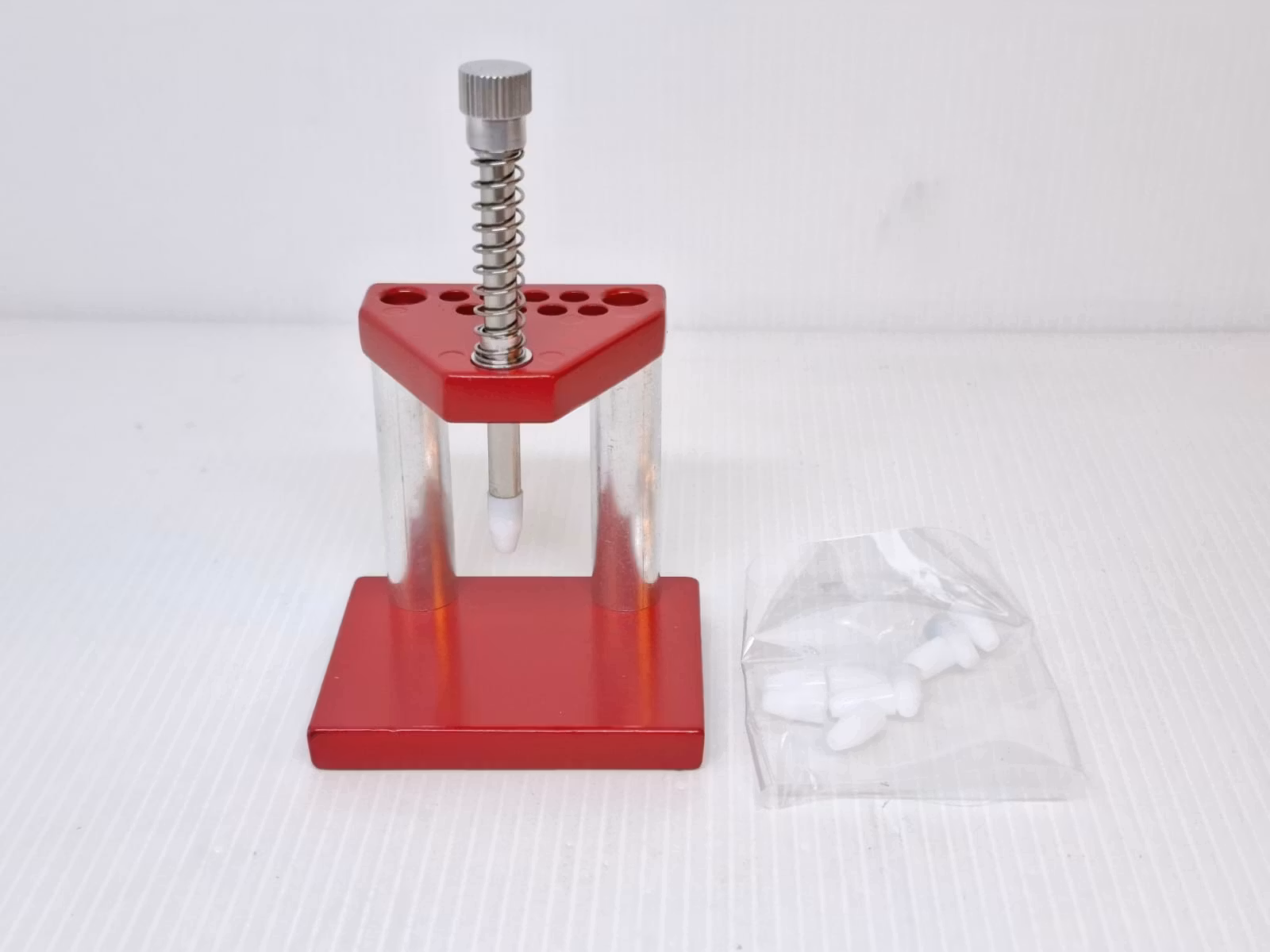 Du köper en vispress som ett praktiskt verktyg för att kunna pressa fast/pressa tillbaka visarna på klockan. Det medföljer 10 stycken vita munstycken som är gjorda av nylon. Dessa kan med fördel placeras i små färdiga hål som sitter på vispressens ovansida (se bilder). Materialet på vispressen är av rostfritt stål. Vispressens vikt är ca 120 gram.